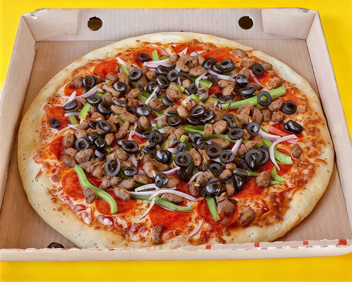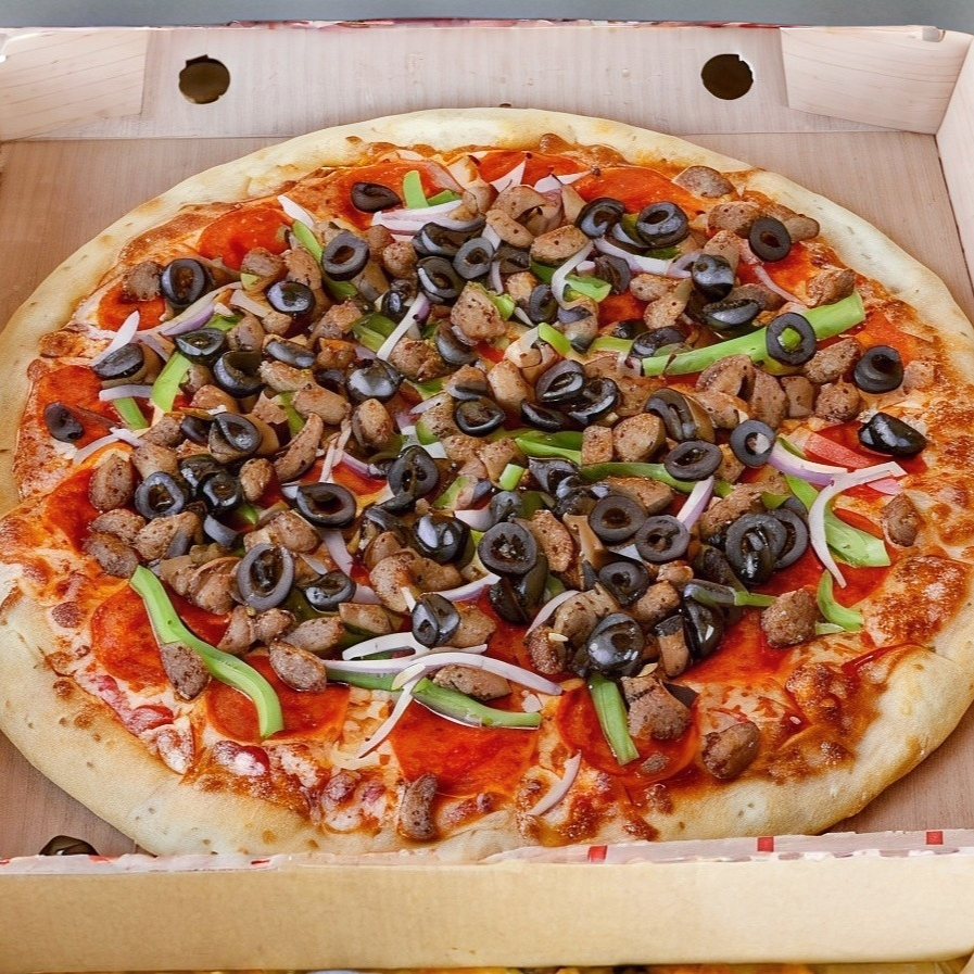 Pizza Italina, masa fresca del día, exquisita salsa de tomate de la casa , queso mozarella, pimiento verde, cebolla morada, aceituna negra, salchicha italiana y pepperoni
