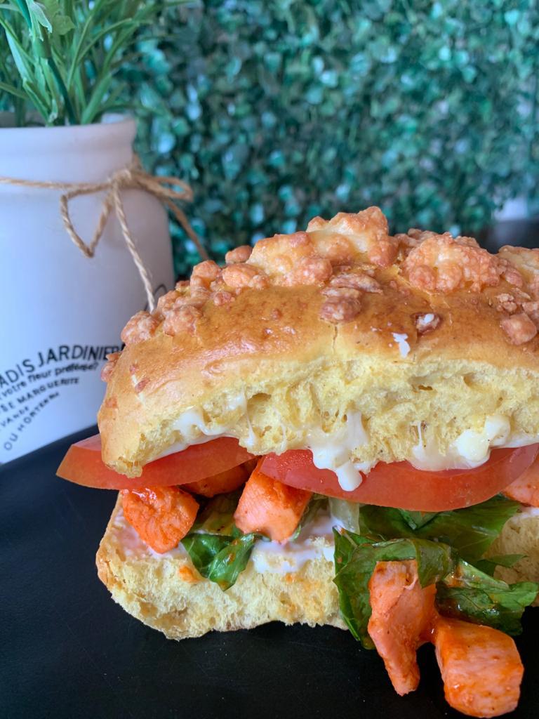 Pan Artesanal, pollo Buffalo, queso manchego, lechuga aderezo ranch y tomate