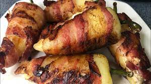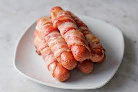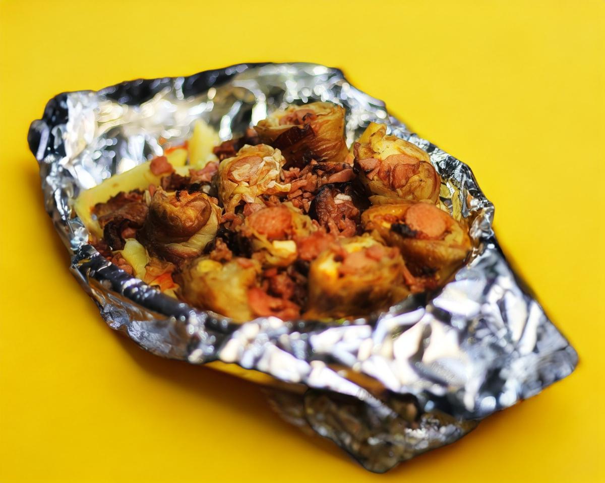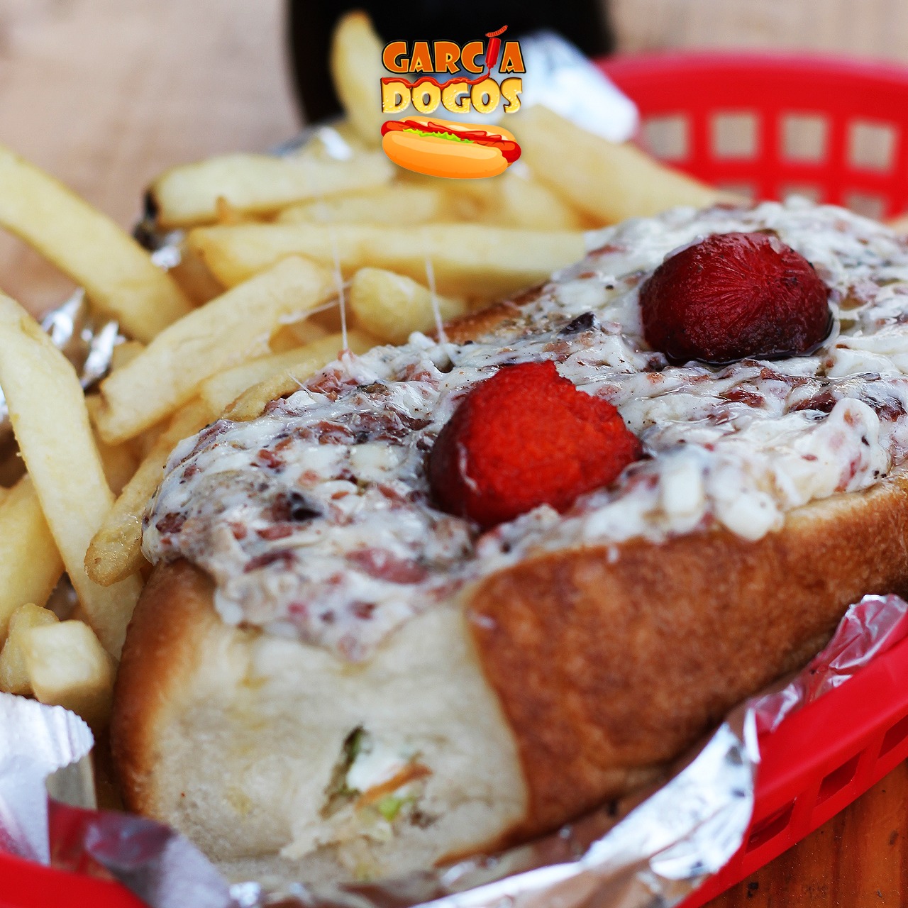 1 Salchicha para asar envuelta en tocino junto con winnie rosarito finamente picado, con un baño de queso mozarella encima. Incluye papas.
