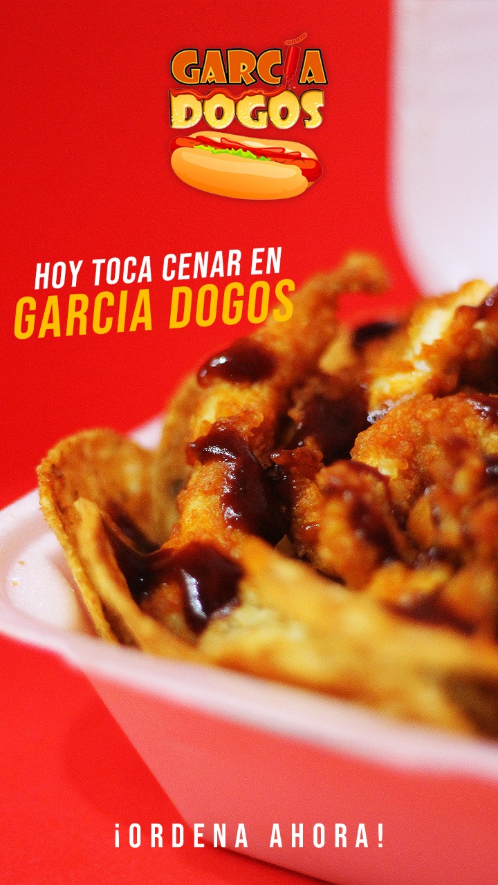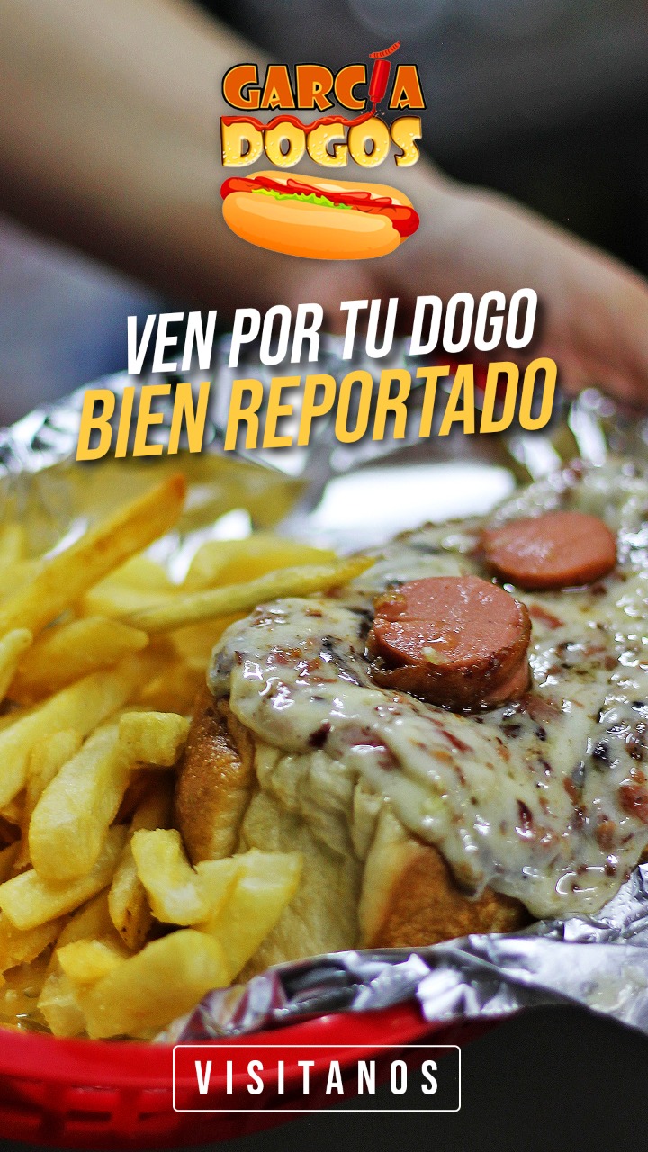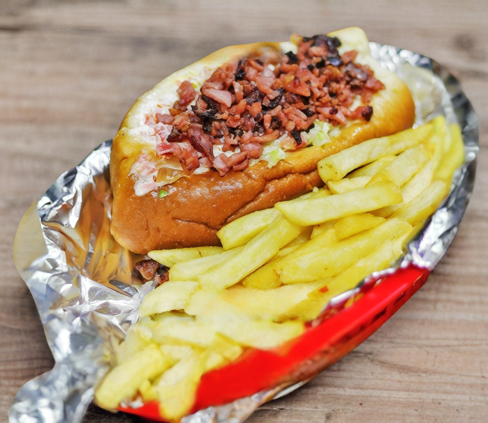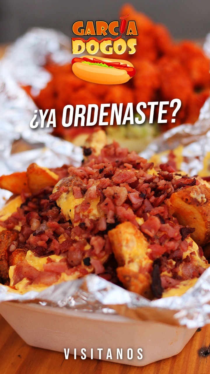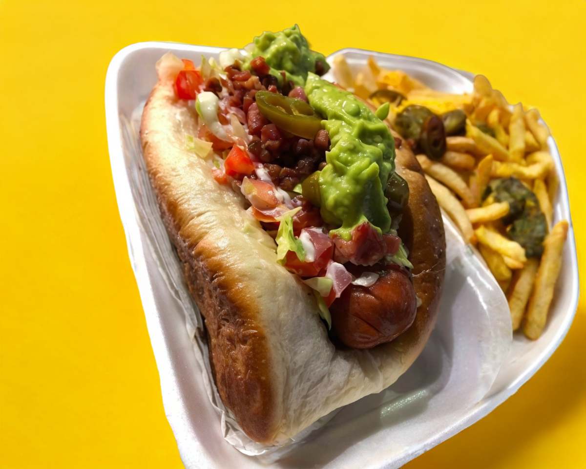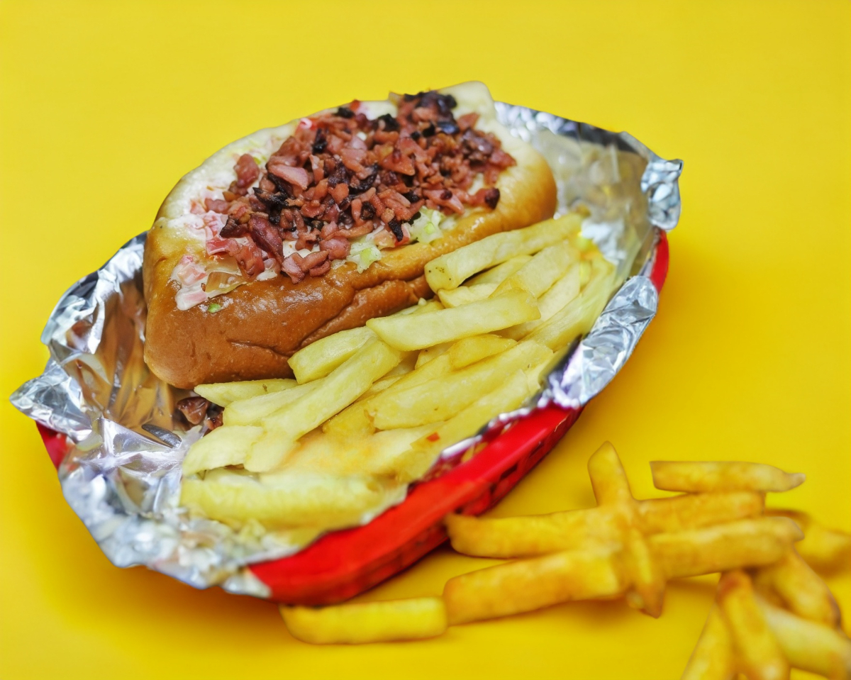 3 Salchichas con tocino picado, incluye una cama de papas, cebolla, frijol, lechuga y tomate.