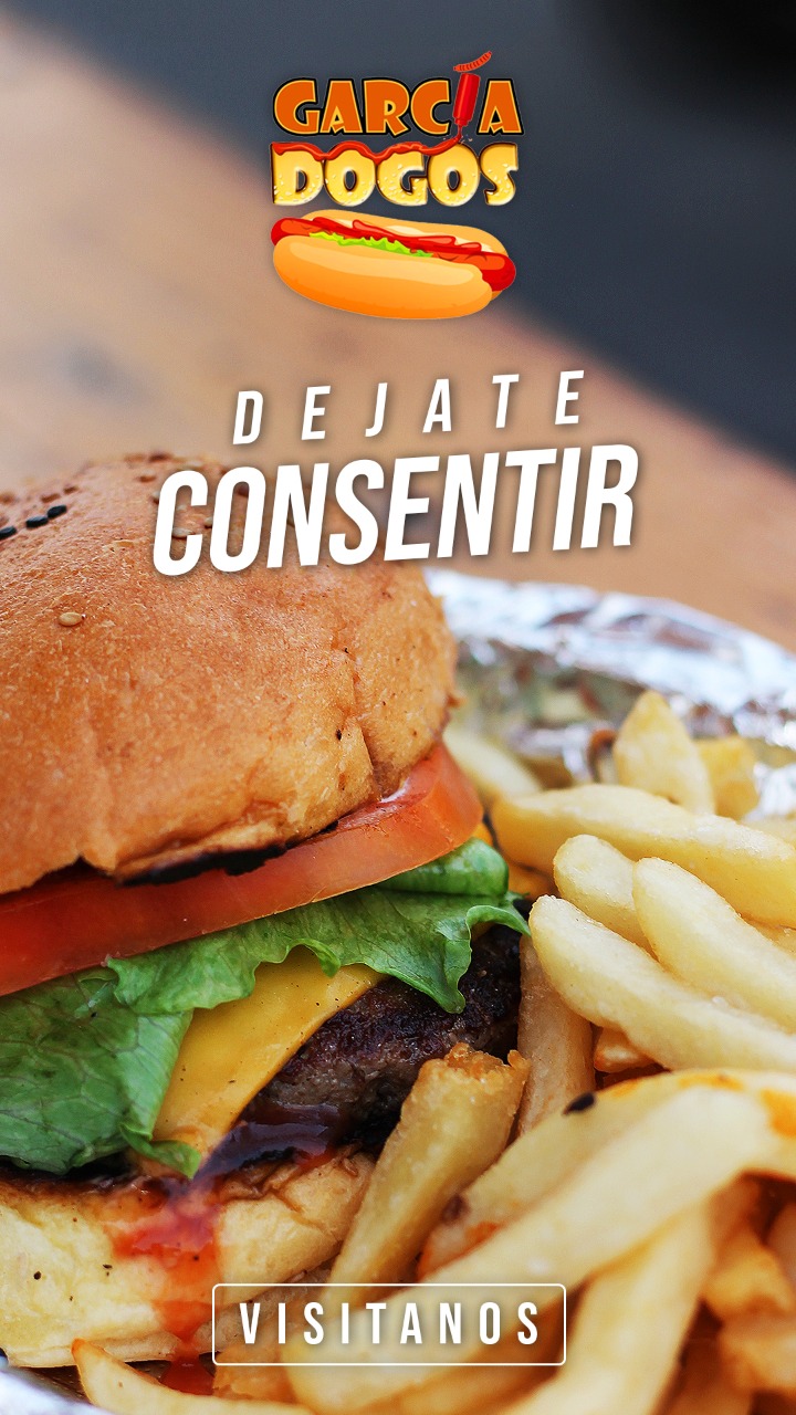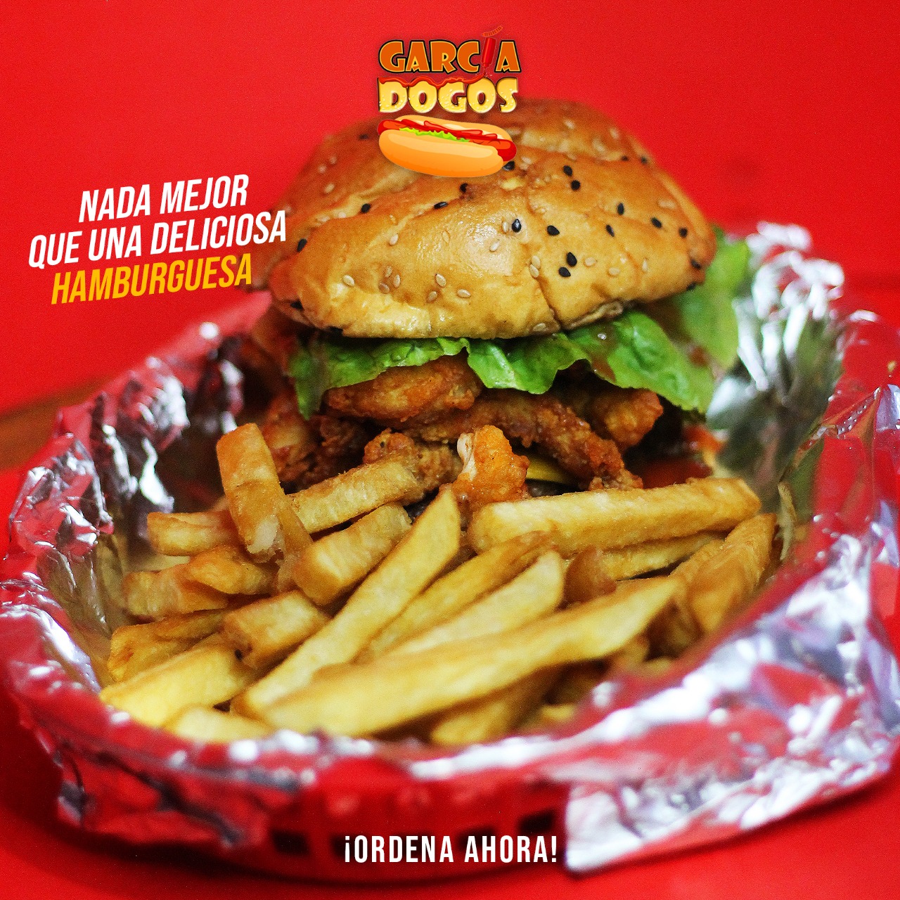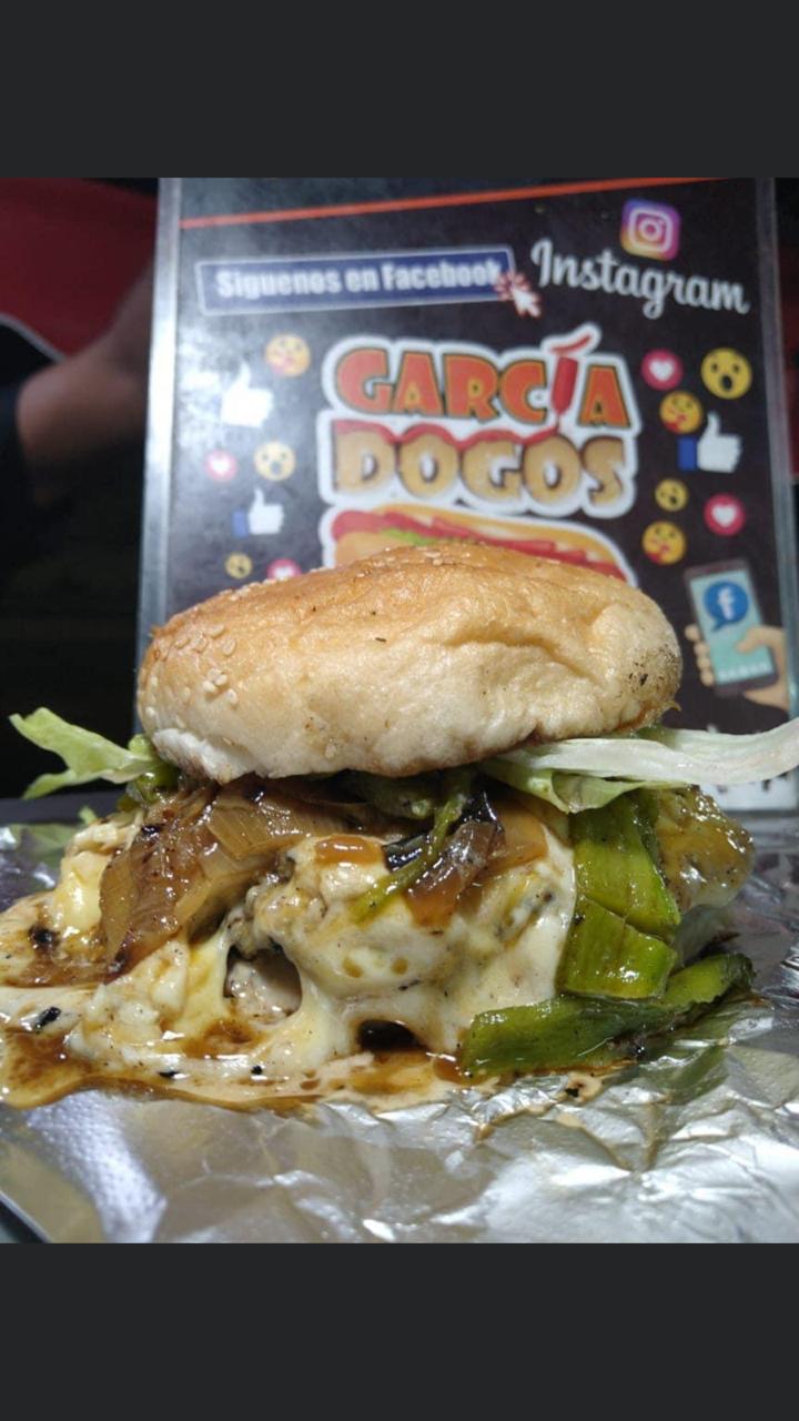 Carne de res con 3 quesos, chile verde, lechuga, tomate, aderezo, catsup y queso americano.