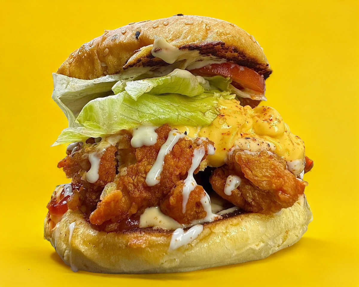 250gr de pollo empanizado, lechuga, tomate, aderezo, catsup y queso americano.