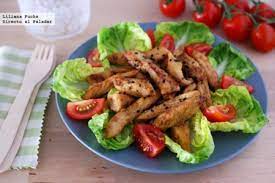 Pollo empanizado natural sobre una cama de lechuga orejona, pepino en media luna, zanahoria rallada, frituras o crotón.