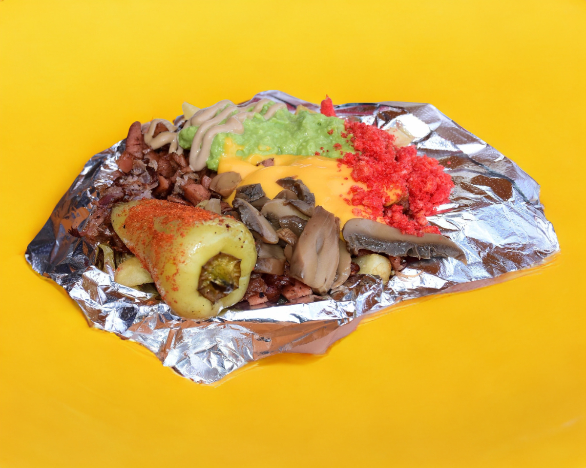 2 Tortillas rellenas con wini rosarito, frijol de fiesta, queso chihuahua, chipotle y tocino.