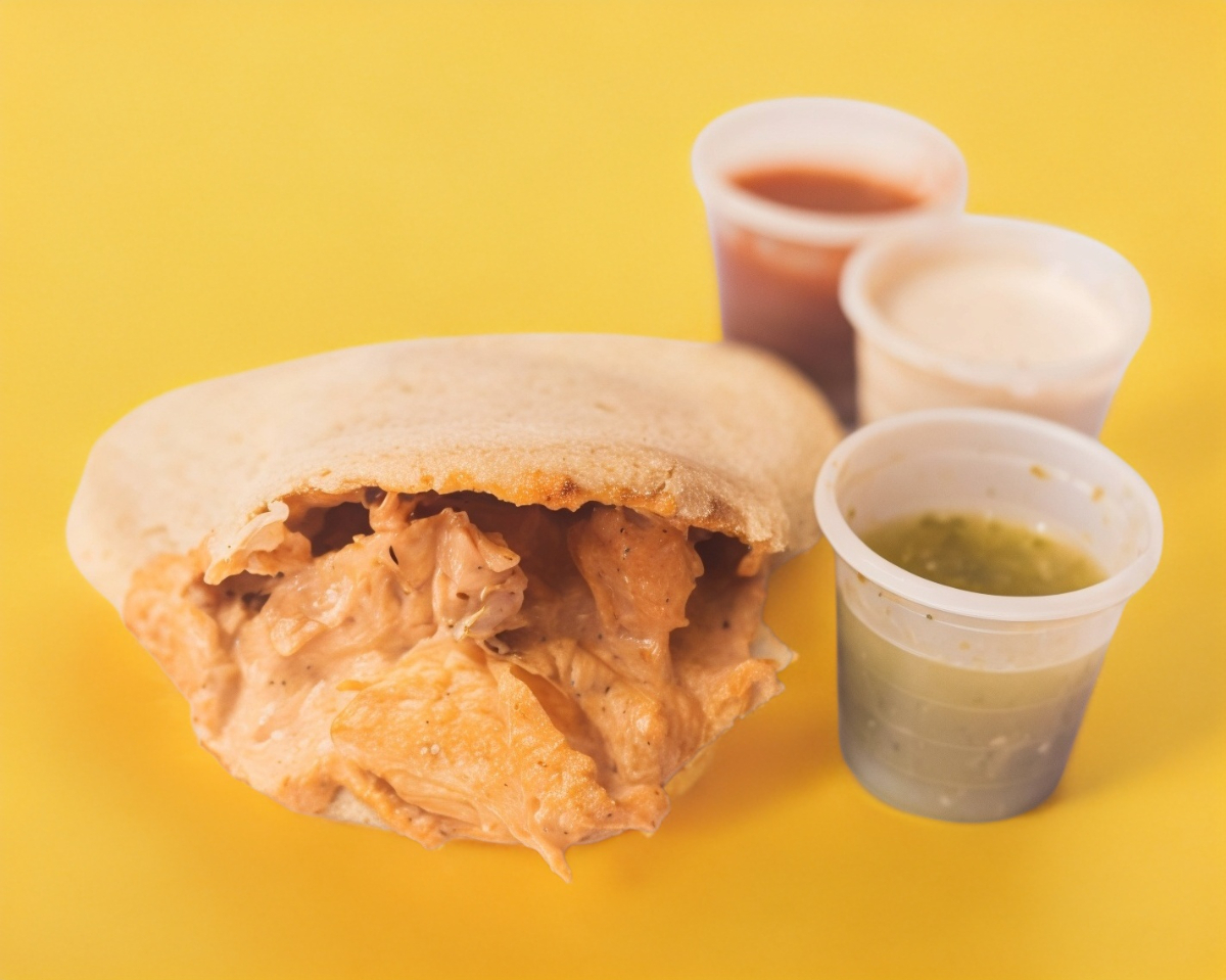 Gordita rellena de pollo en crema de chipotle (no contiene mayonesa ni aderezos).