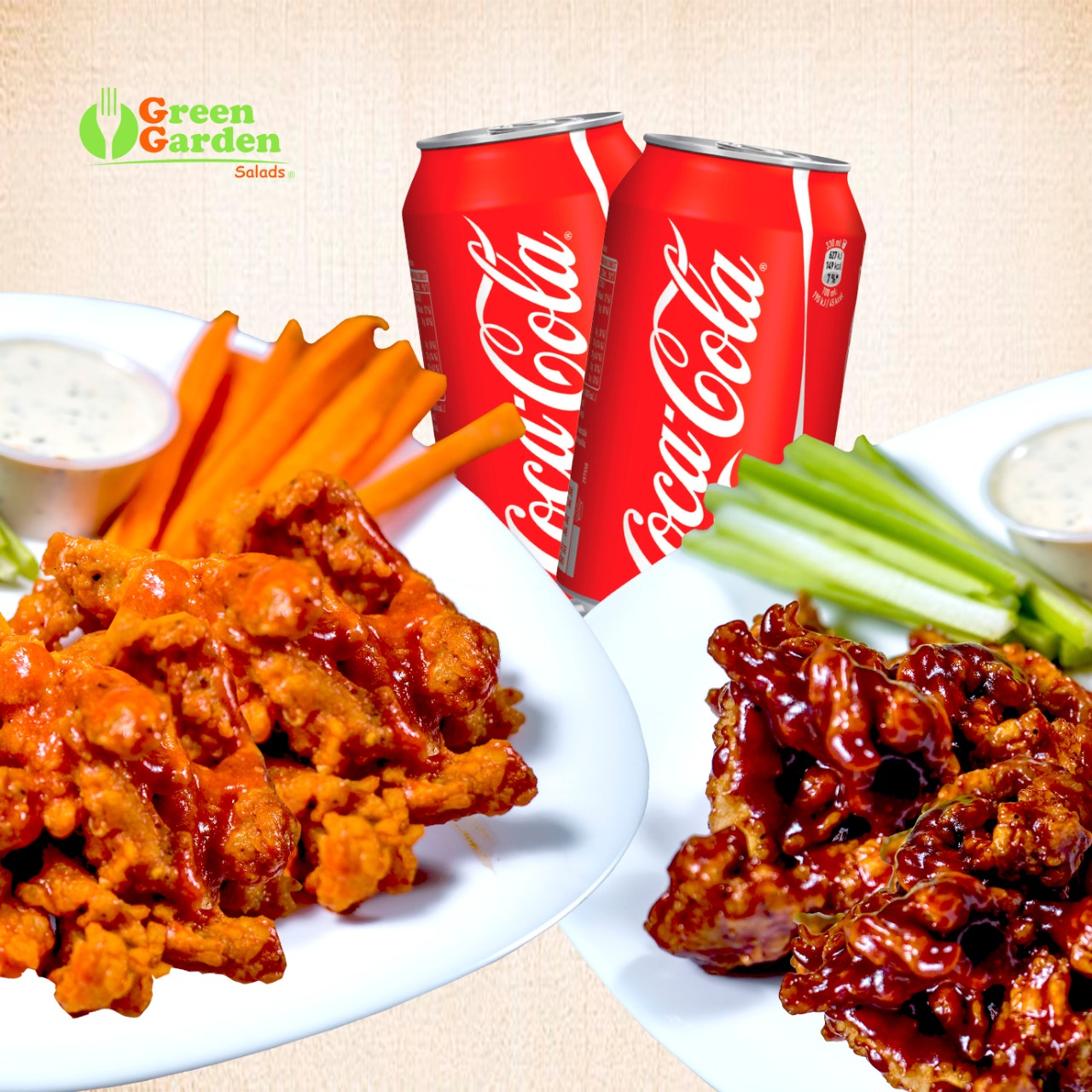 3 porciones de pollo, 5 de barra fría, queso parmesano y ajonjolí, Carlton o fritura y 2 aderezos a elegir.