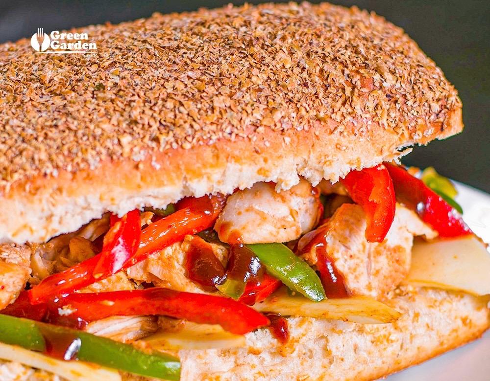 Pechuga de pollo, pimiento verde y rojo, champiñone flameado con mantequilla, queso mozarella y aderezo especial.