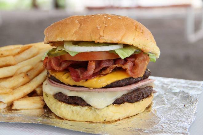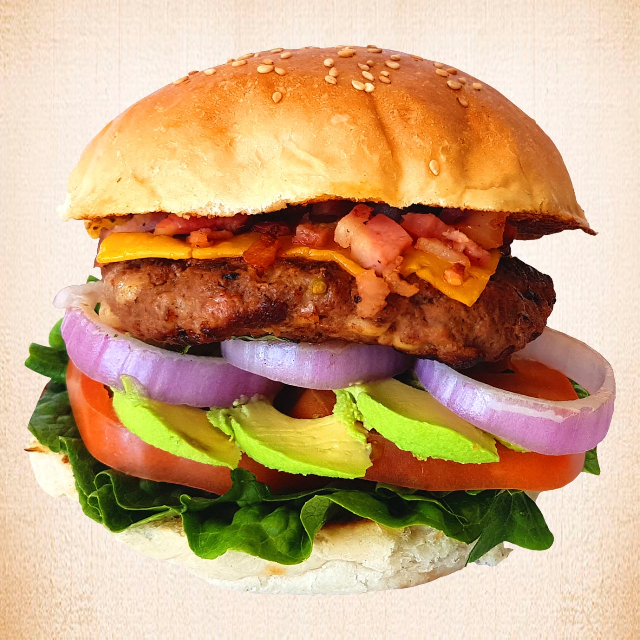 Carne sirloin, lechuga, tomate, aguacate, cebolla morada, tocino, queso cheddar y aderezo chipotle.