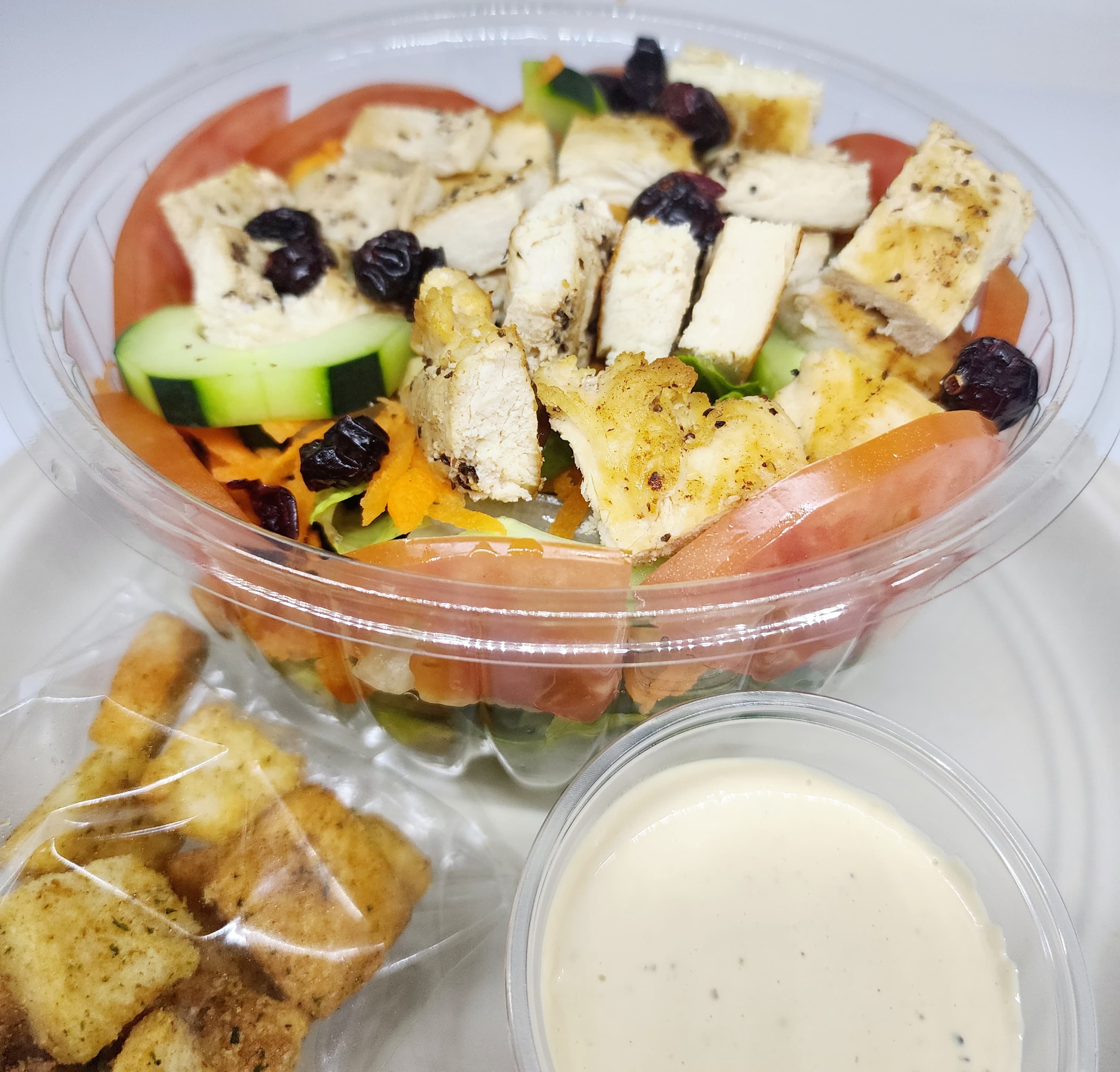 Pollo a la plancha, lechuga orejona, espinaca baby, tomate, zanahoria, pepino, arandano, fritura o cruton.