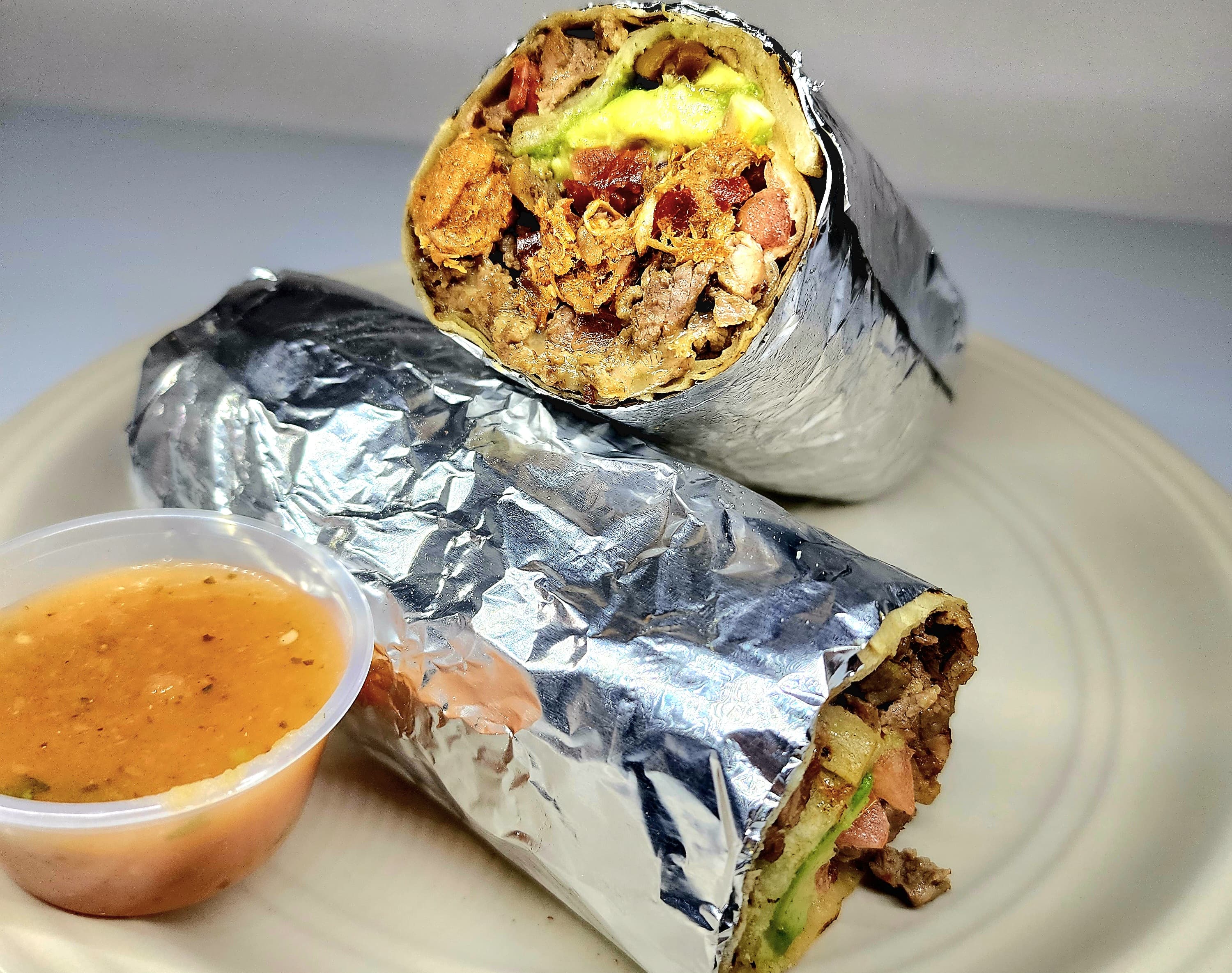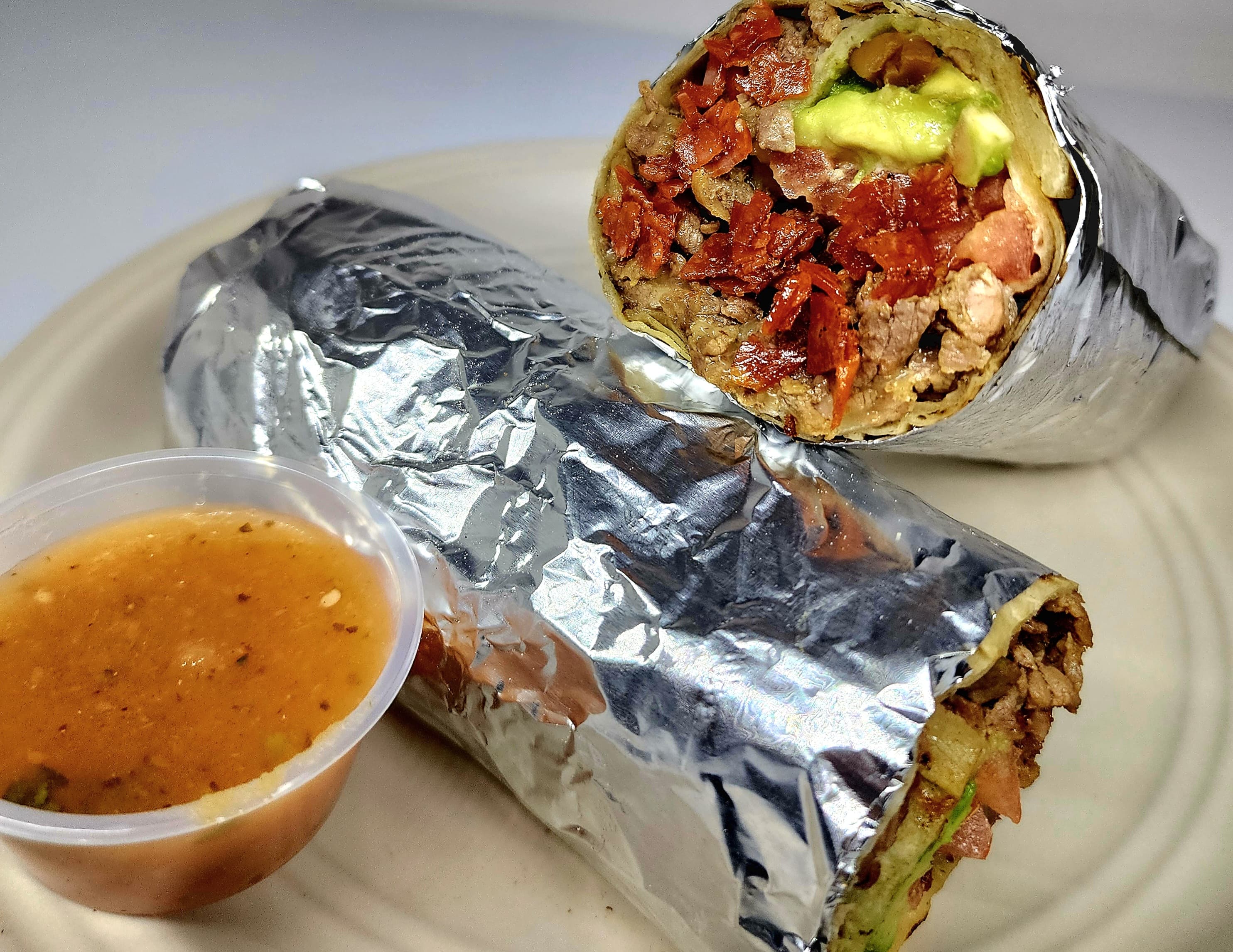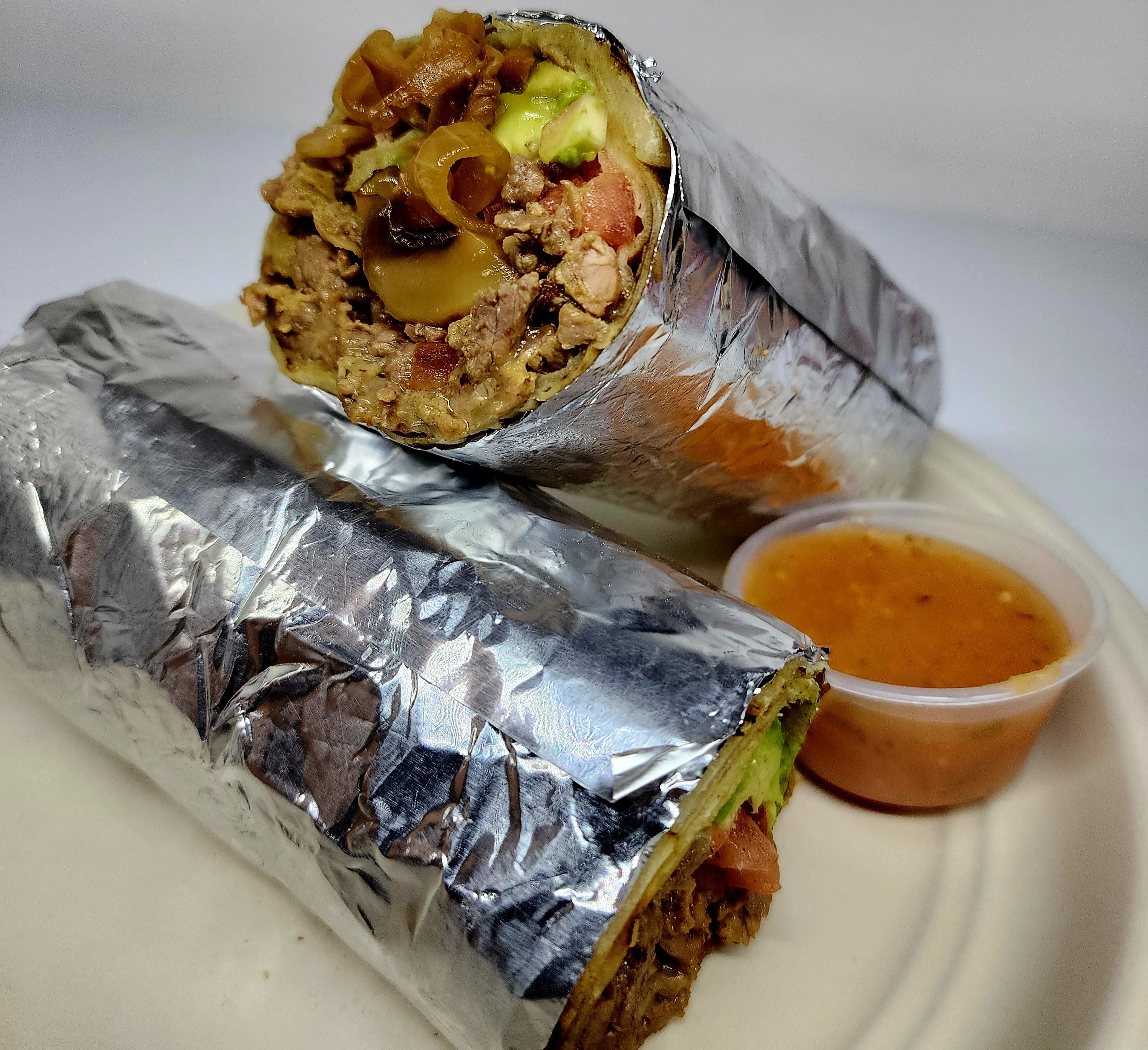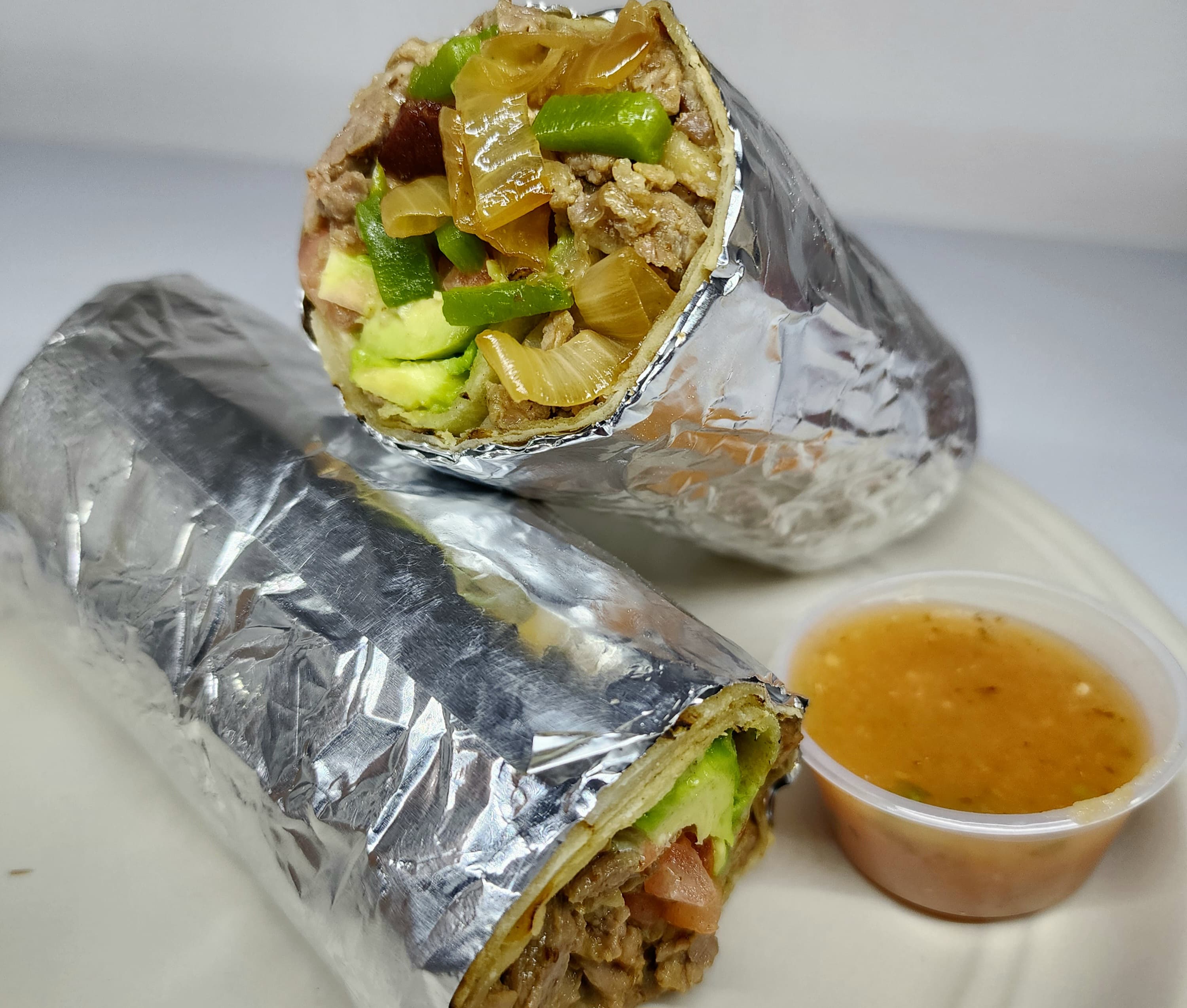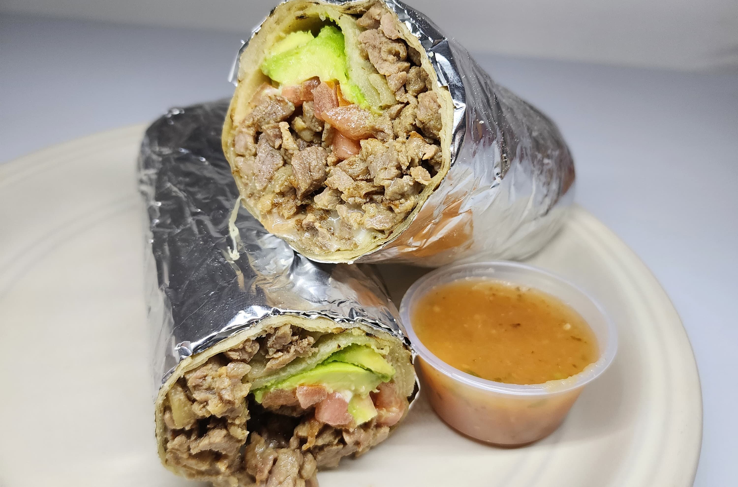 Carne de res, carne adobada, queso, tomate y aguacate.