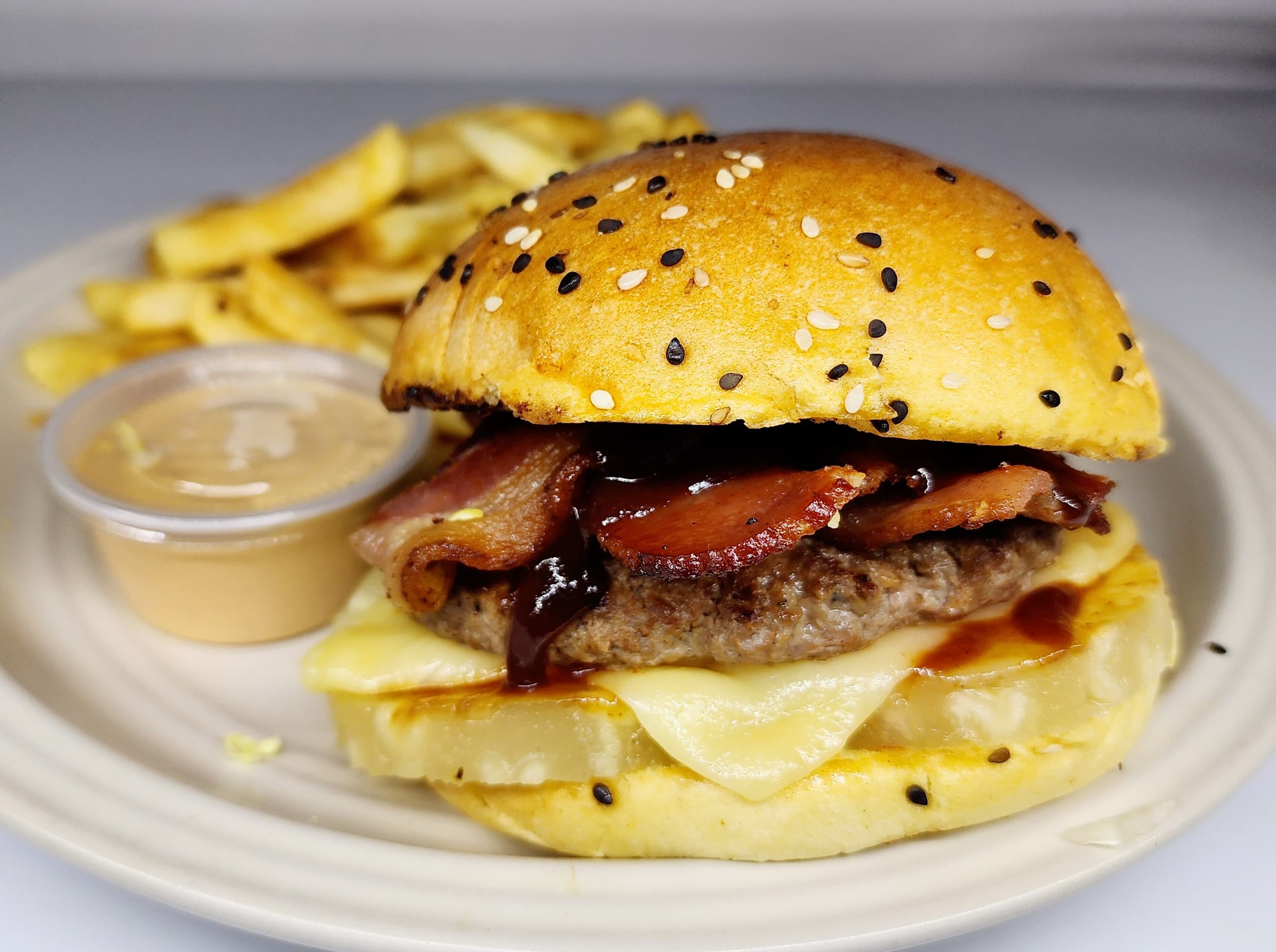 Carne 100% res, queso blanco, piña salteada, tocino y bbq.