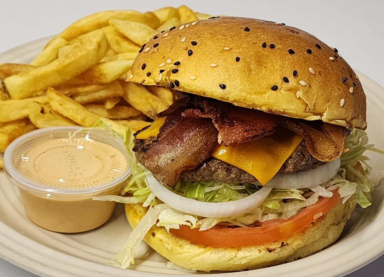 Carne 100% res, queso amarillo, tocino, lechuga, tomate y cebolla.