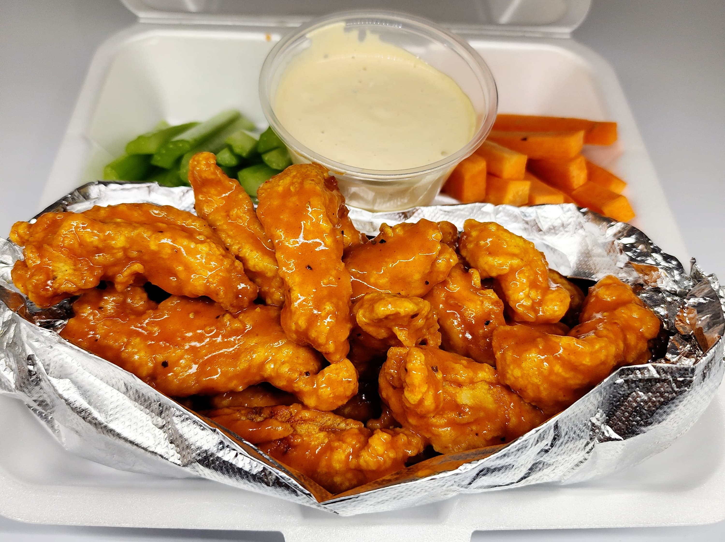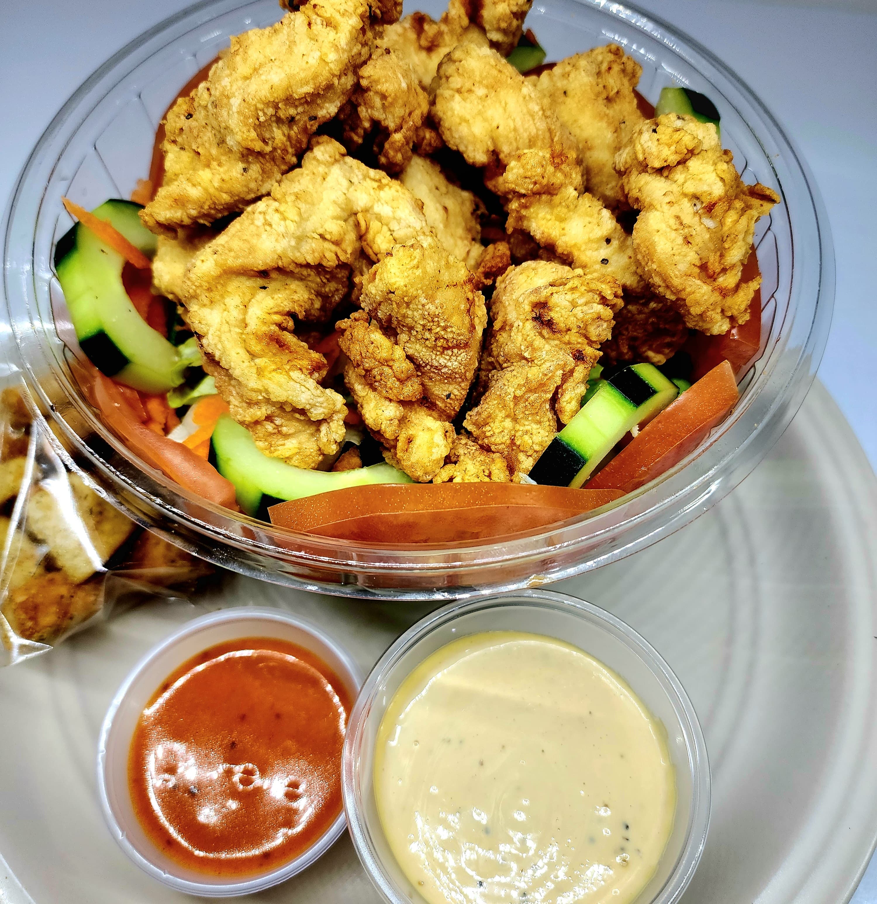 Boneless, salsa a elegir, lechuga orejona, tomate, apio, zanahoria, pepino, fritura o cruton.