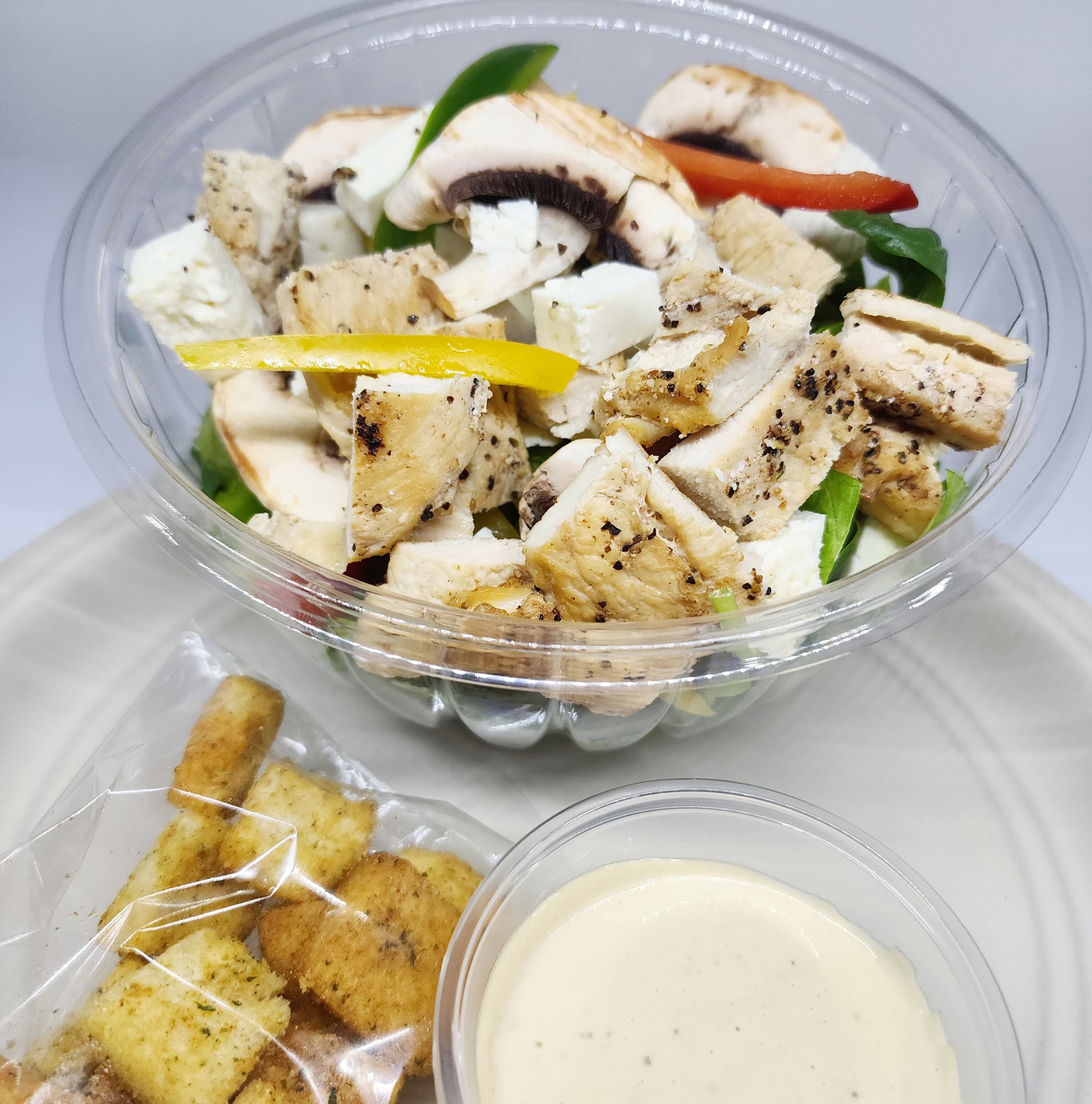 Pollo a la plancha, lechuga orejona, queso panela, pimientos, aceituna negra, champiñon natural, fritura o cruton.