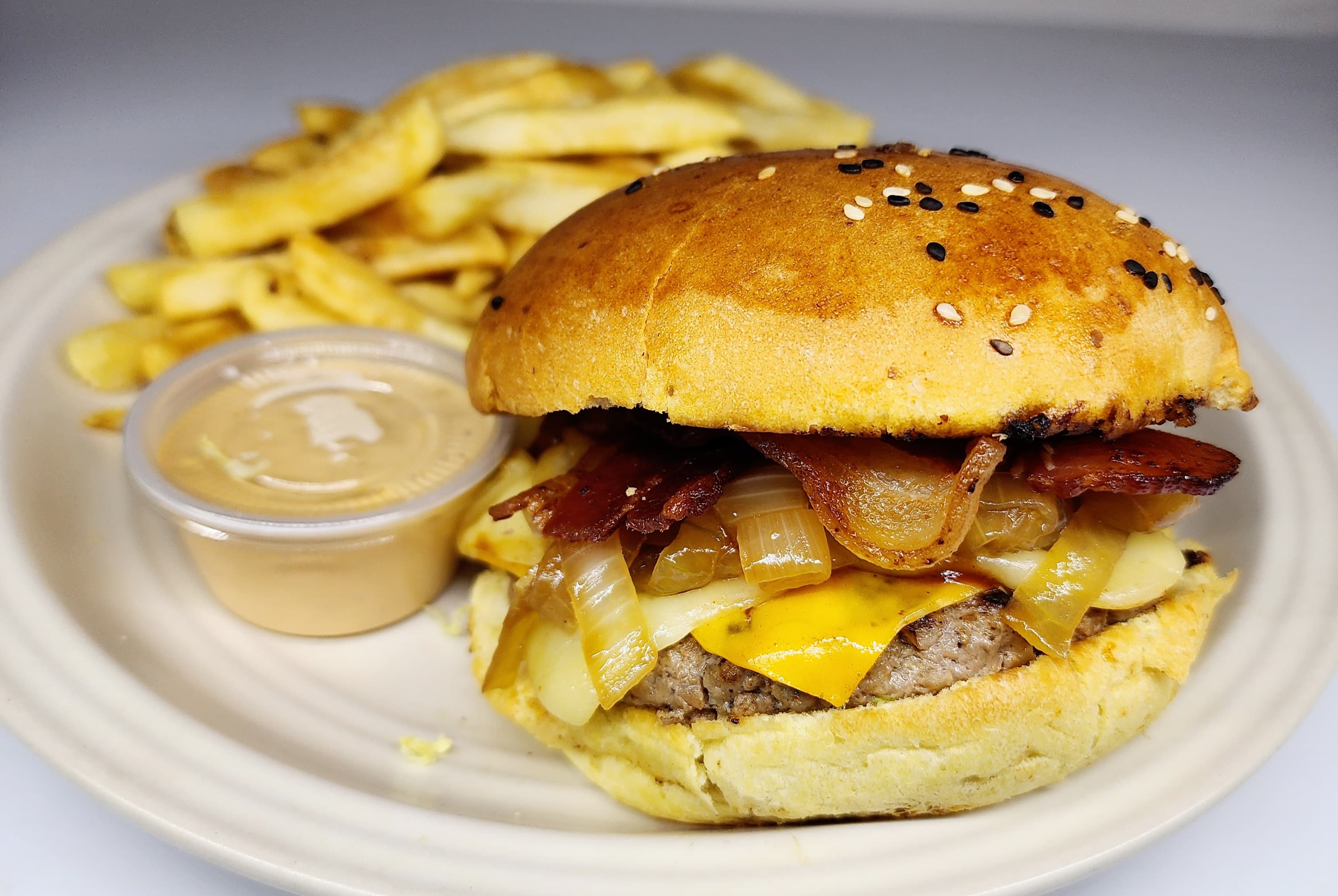 Carne 100% res, queso amarillo, queso blanco, cebolla caramelizada y tocino.