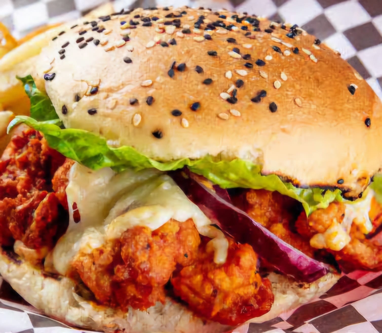 Boneless, salsa a elegir, queso blanco, lechuga, tomate y cebolla.