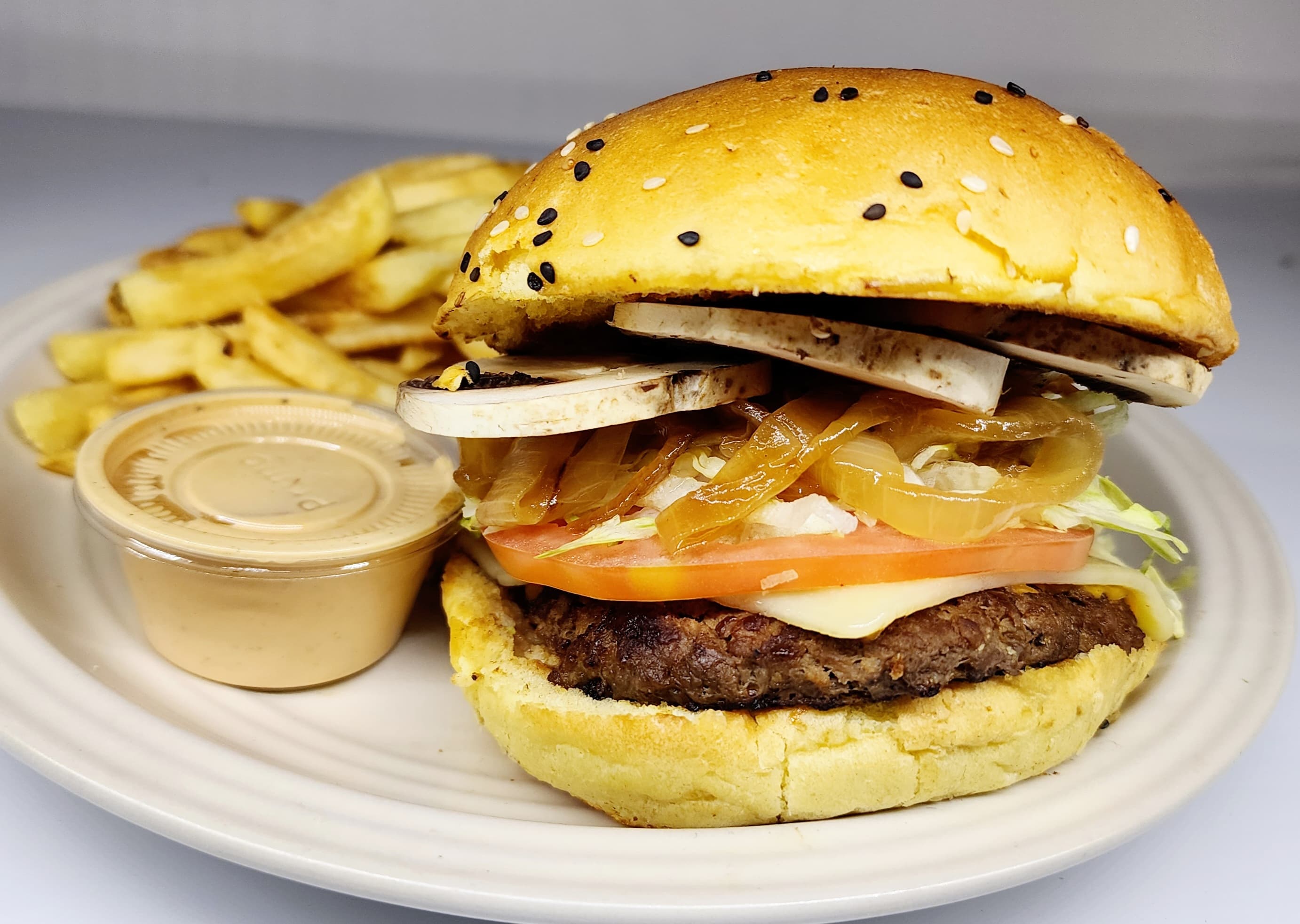 Carne 100% res, queso blanco, champiñones salteados, cebolla caramelizada, lechuga y tomate.