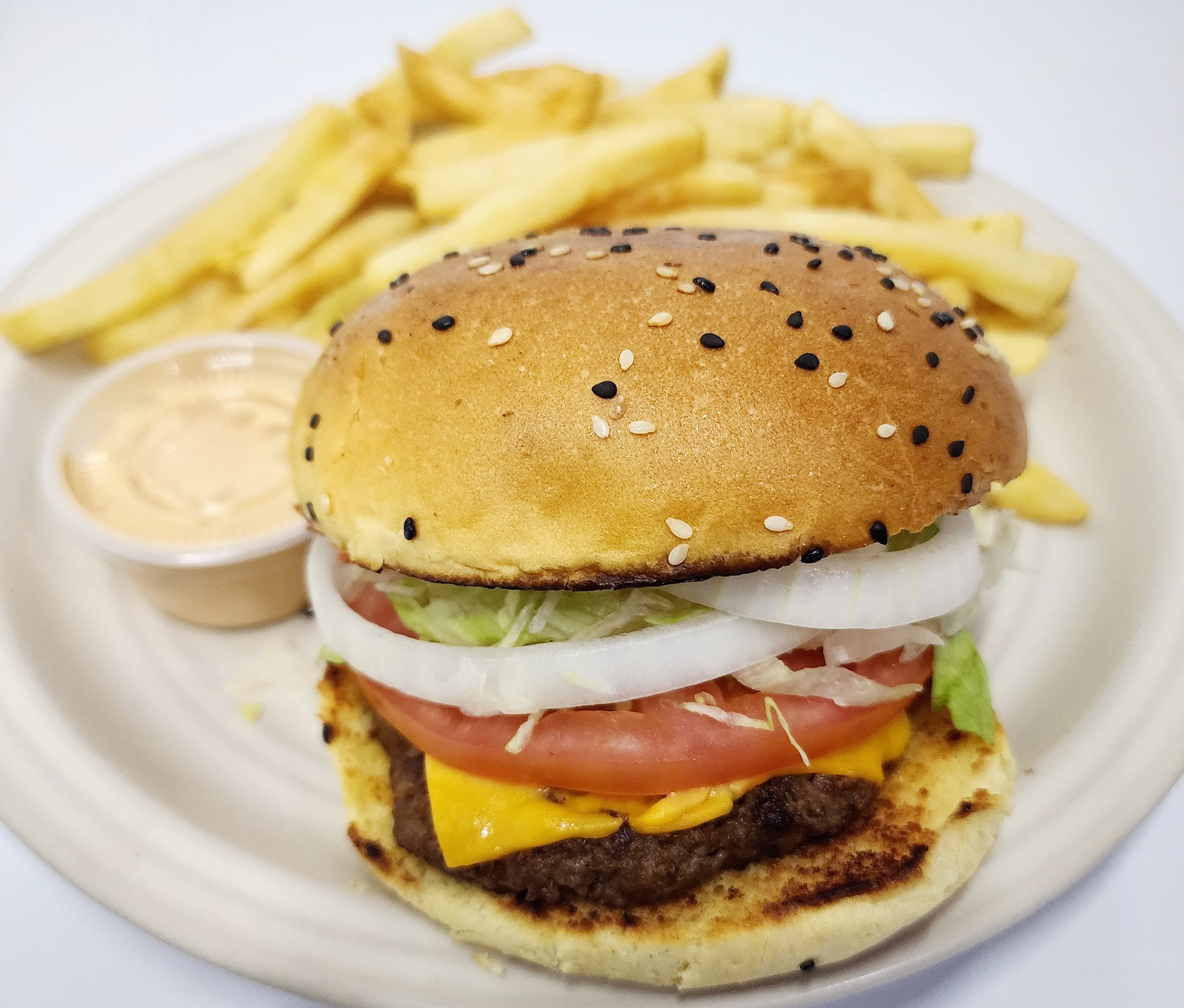 Carne 100% res, queso amarillo, lechuga, tomate y cebolla.