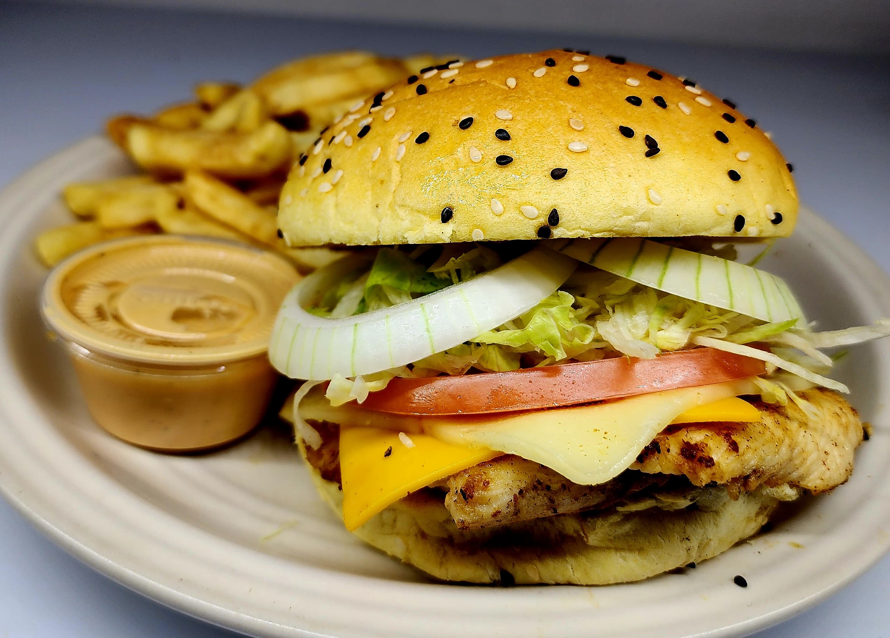 Pechuga de pollo, queso blanco, lechuga, tomate y cebolla.