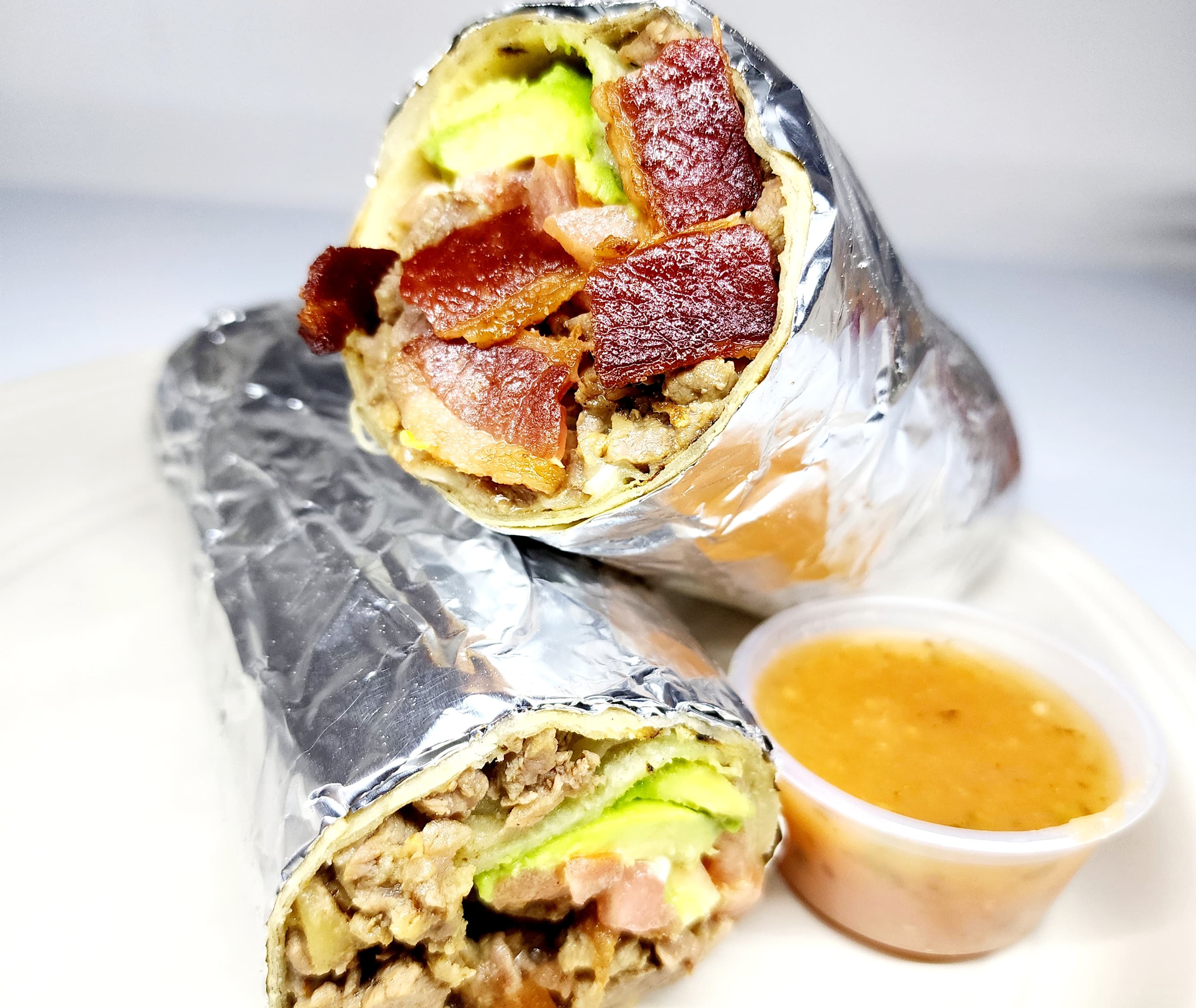 Carne de res, queso, peperoni, tocino, tomate y aguacate.