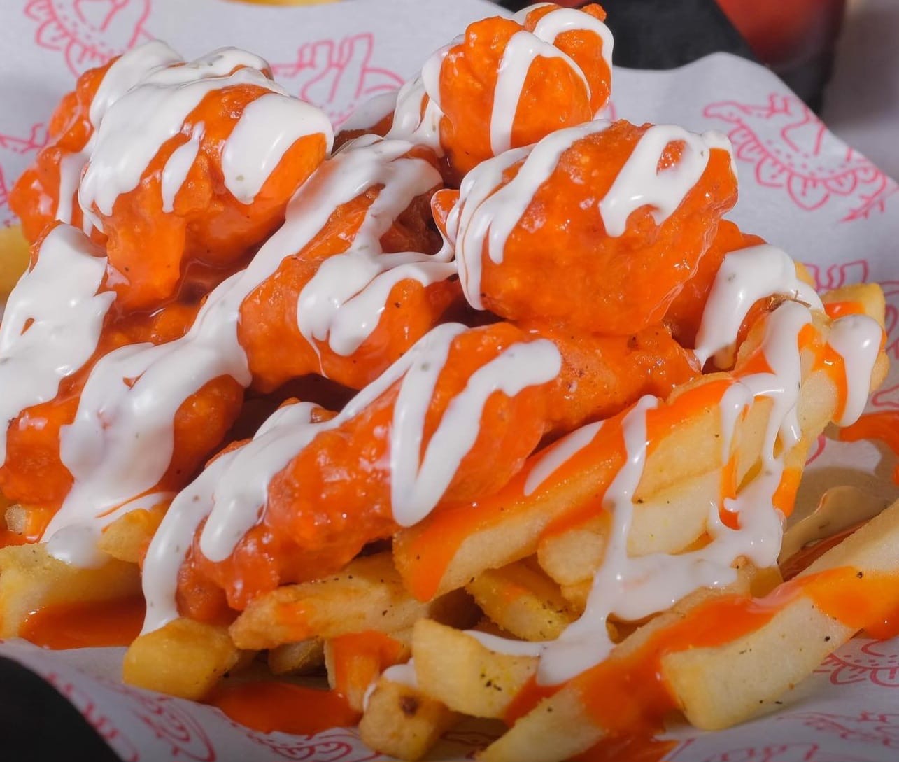 Papas francesas, queso chedar liquido, aderezo y salsa a elegir.