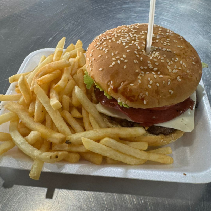 1 carne c/bbq, Queso amarillo, tocino, lechuga, tomate, cebolla, mayonesa, catsup, mostaza