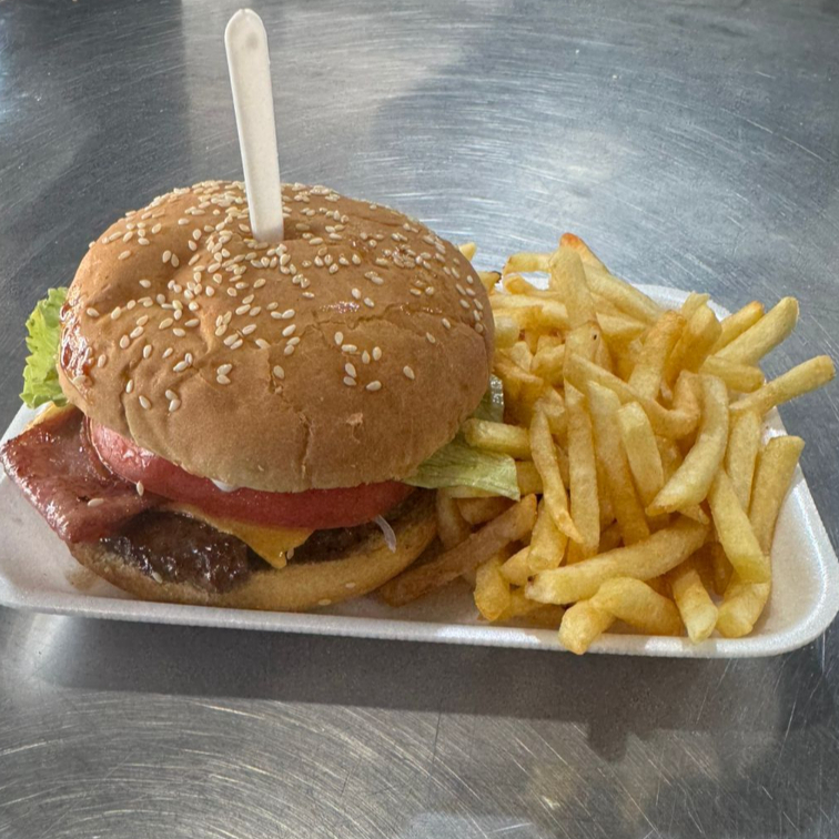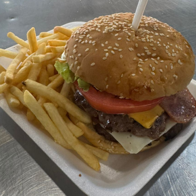 2 carne c/bbq, Queso blanco,Queso amarillo, tocino. jamon, lechuga, tomate, cebolla, mayonesa, catsup, mostaza