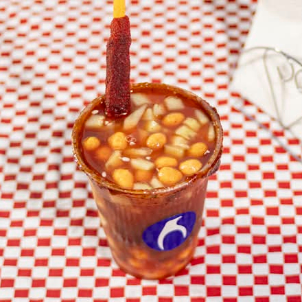 Con clamato, chaca chaca, rialito, pepino, cacahuate japonés.