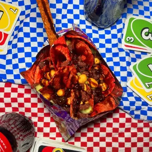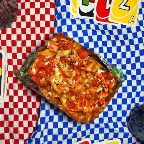 Sabritas preparadas con chaca chaca, rialito, pepino, clamato, limón, banderilla.
