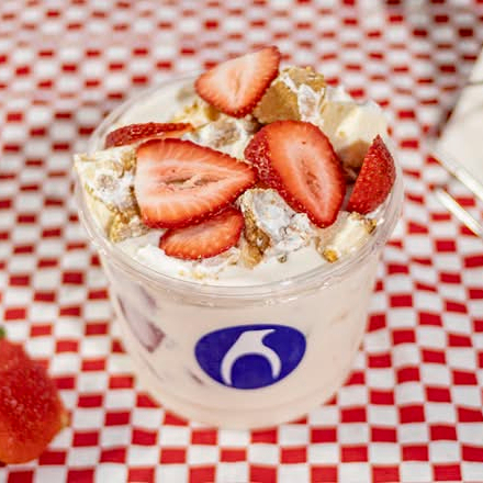 Fresas naturales con crema de la casa, crema de cacahuate, trozos de pay de limón, crema batida y galleta lotus una combinación cremosa. Contiene nueces.