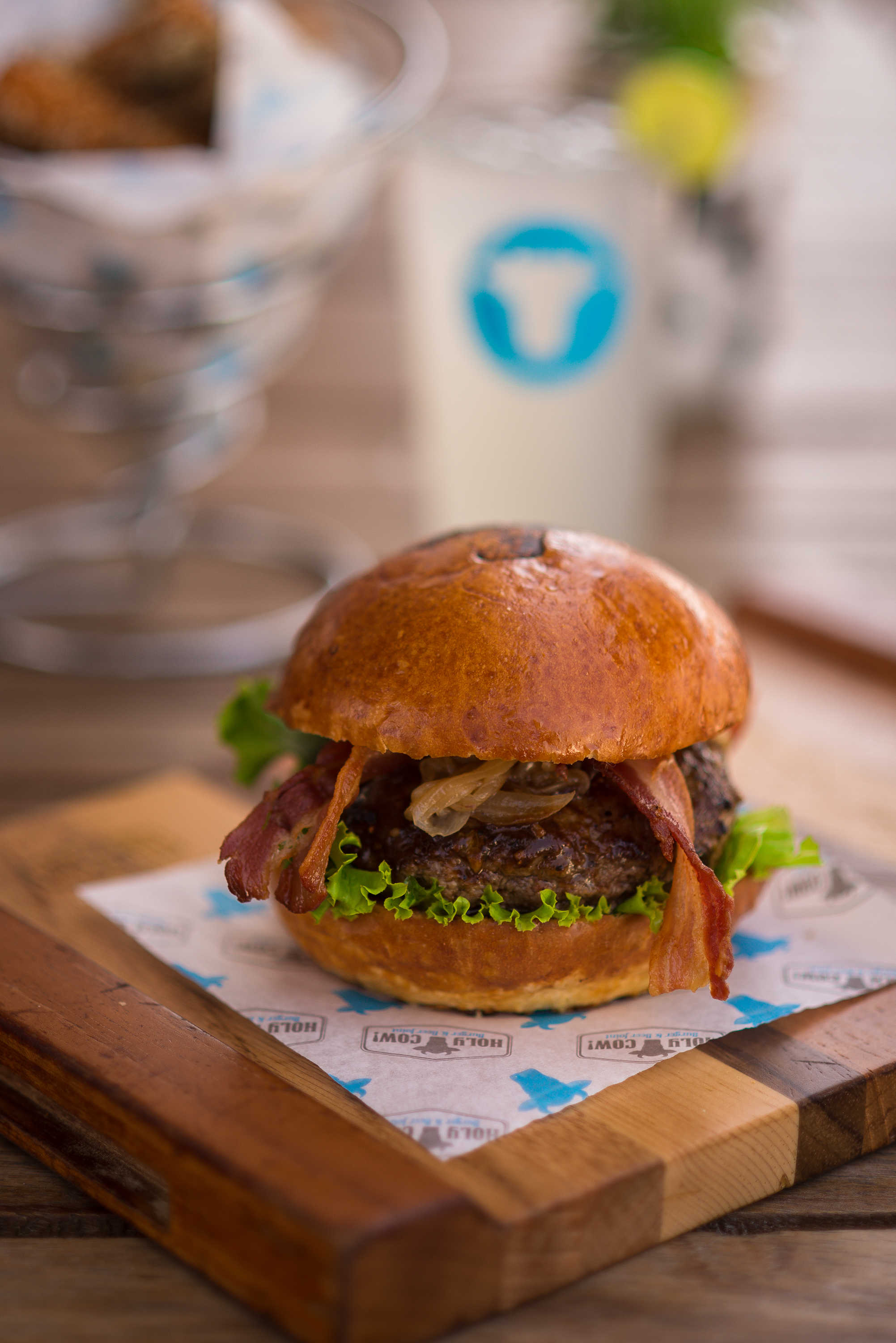 180gr. Doble carne, cebolla asada, doble queso americano, tocino y aderezo Holy Cow!