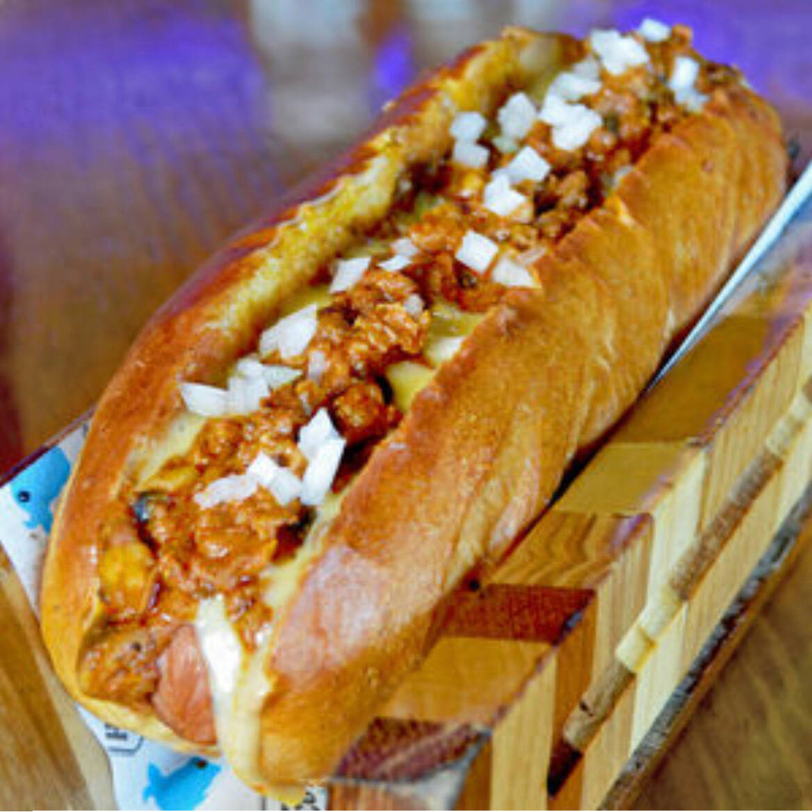 124gr. Salchicha asada, chili beans, cheddar cheese sauce y cebolla.