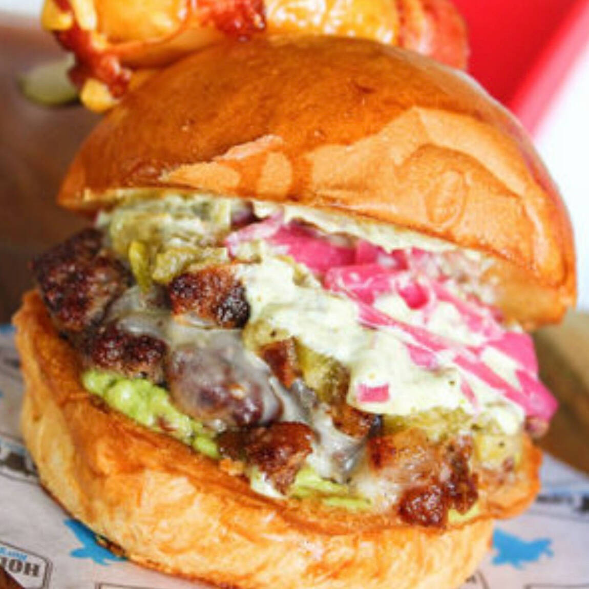 180gr. Tocino, cebolla morada curtida, guacamole, chile verde asado, queso Mty Jack y aderezo Mayo-Cilantro.