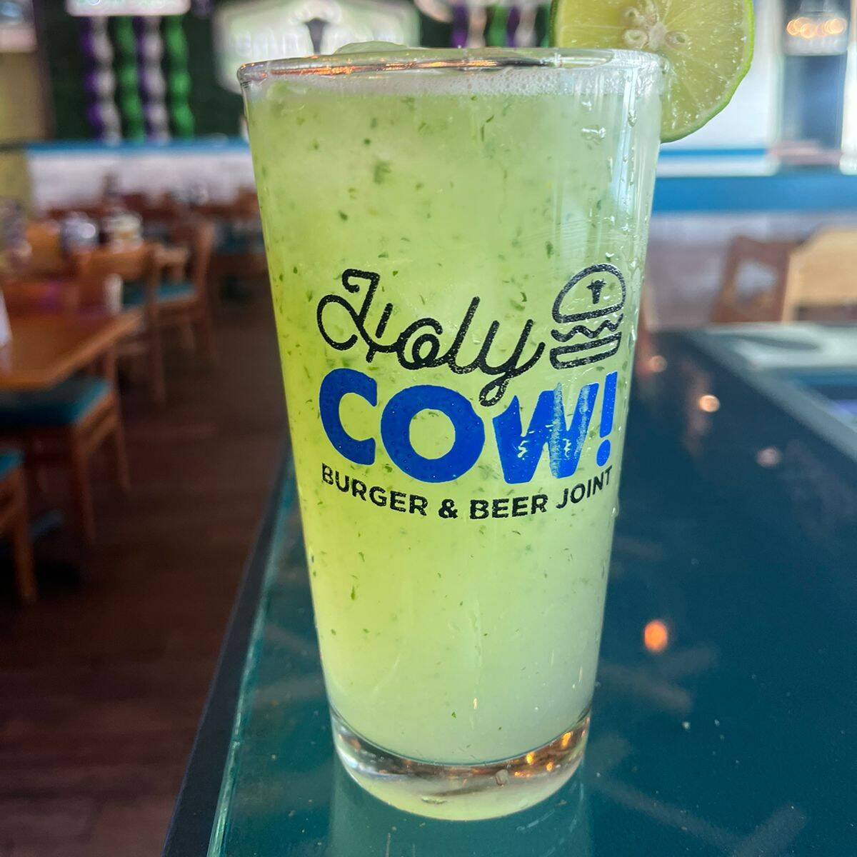 180gr. Rellena de queso azul 15gr, arúgula, tocino, champiñones salteados, cebolla caramelizada y aderezo Aliolí Holy Cow!