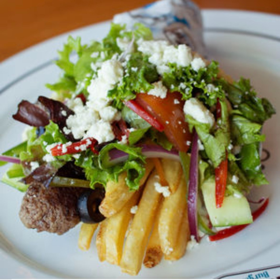 180gr. Carne de res, orégano, pan pita, queso Feta, spring mix, pimientos, cebolla morada, aceitunas negras, pepino, tomate, aderezo Tzatziki, vinagreta de limón real y papas a la francesa.