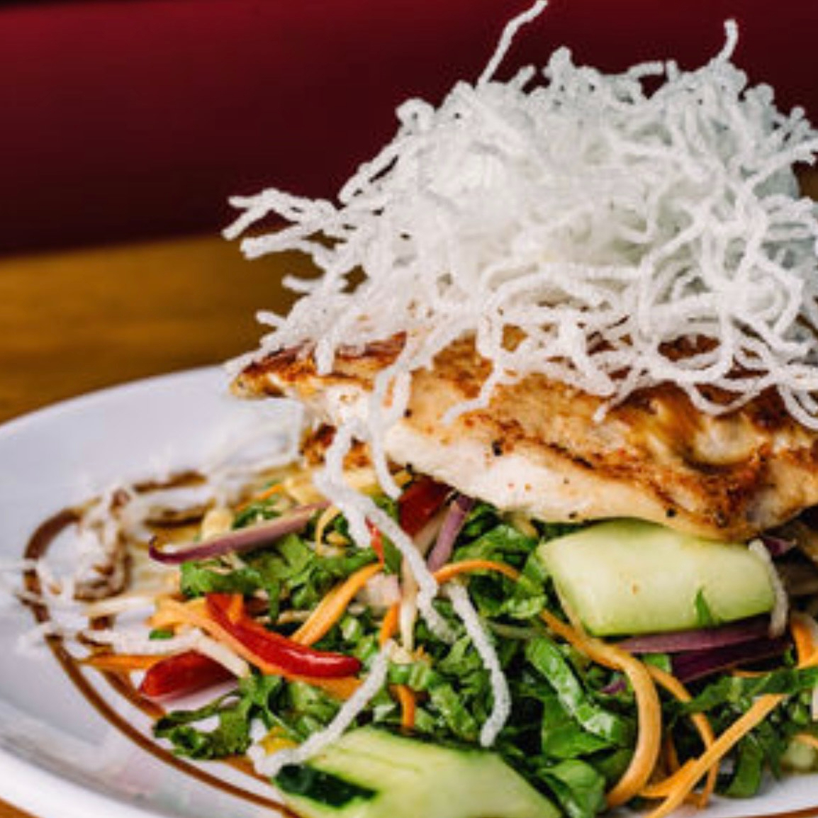 125gr. Pollo, lechuga, cebolla morada, pimientos, vermicelli, zanahoria, germen de soya, pepino, cacahuate, salsa Teriyaqui y vinagreta de ajonjolí.