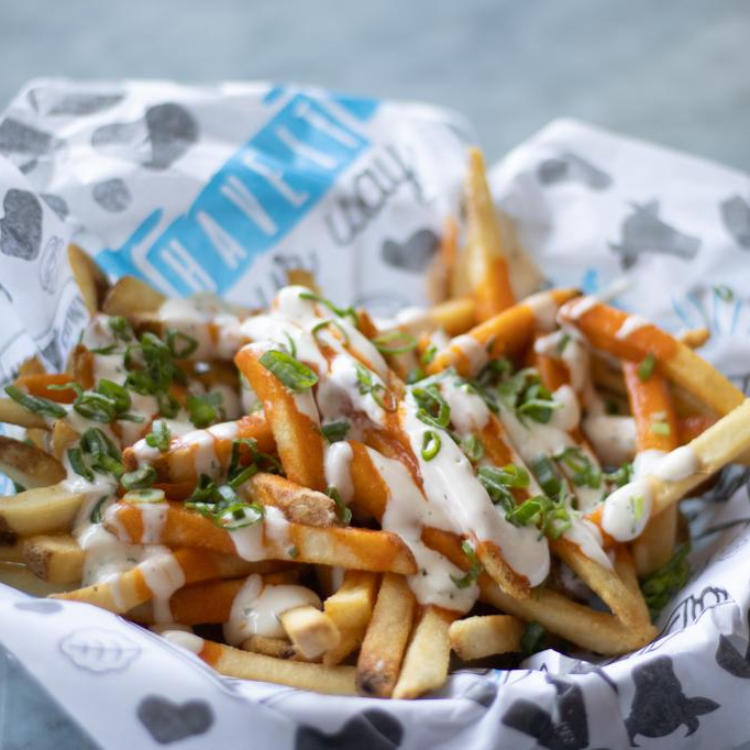 350gr. Cama de papas fritas bañadas de salsa buffalo y aderezo ranch decoradas con cebollín.