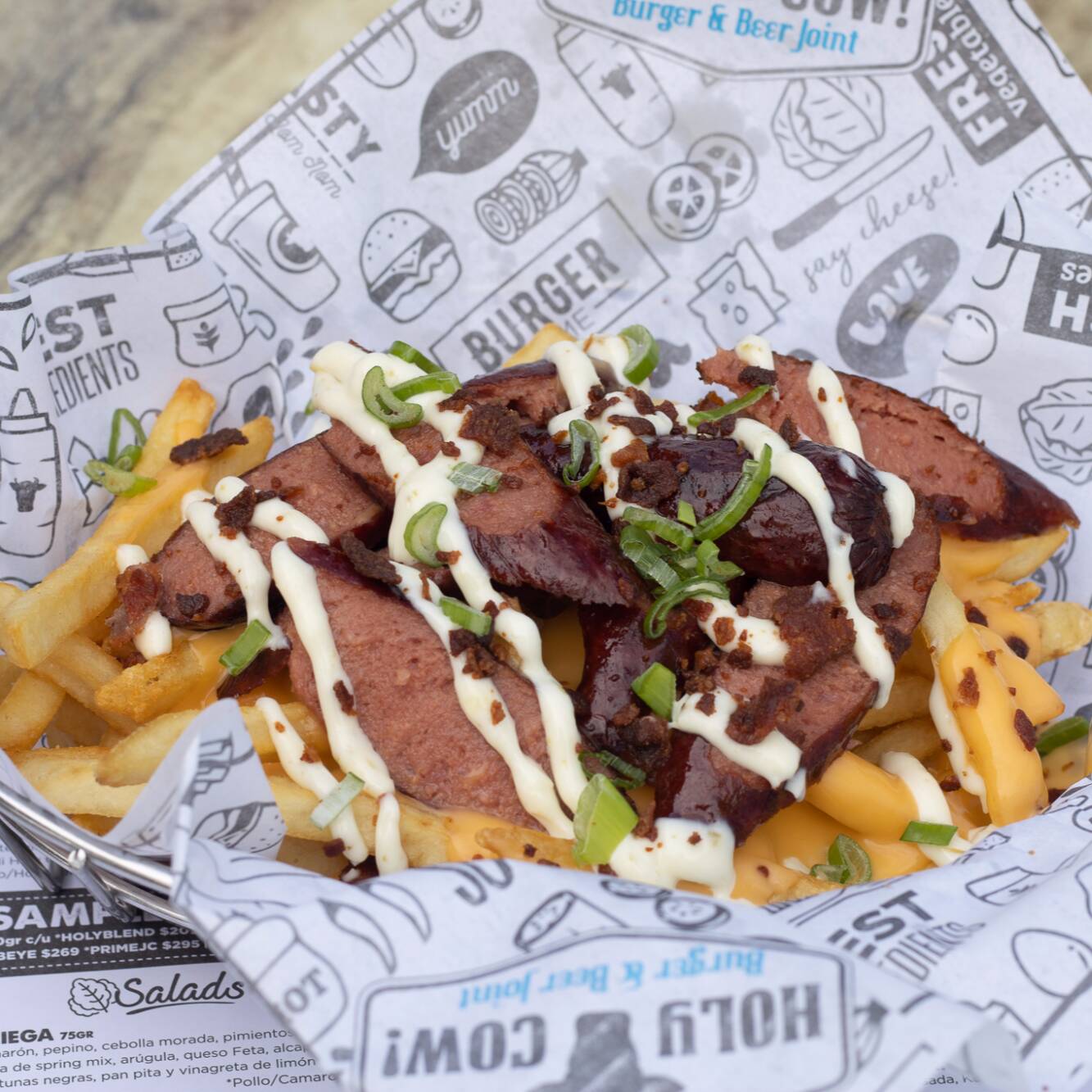 124gr. Cama de papas fritas, bañadas con queso cheddar, salchicha frita rebanada, tocino picado, cebollín y aderezo mayo piquín.