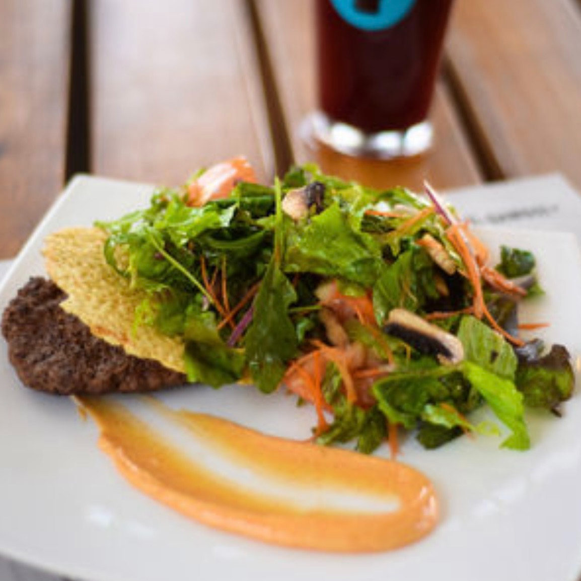 180gr. Tomate deshidratado, champiñones salteados, crujiente de parmesano, cebolla caramelizada, lechuga y aderezo mayo-cilantro.