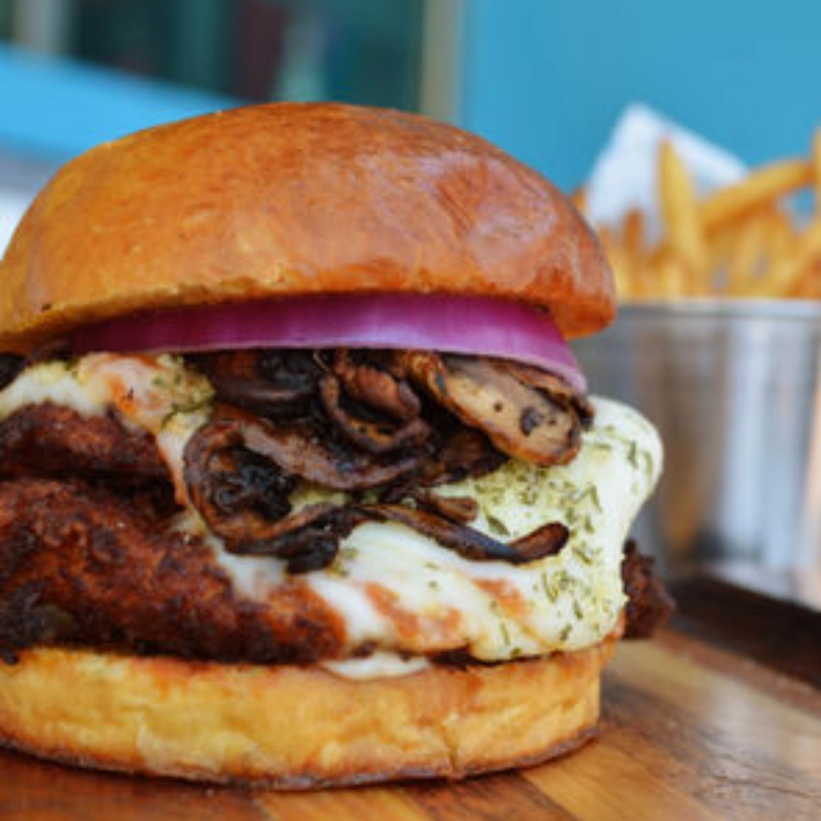 140gr. Pollo empanizado, sazonado con parmesano, perejil y ajo, salsa de tomate, queso mozzarella, champiñones salteados, cebolla morada y aderezo mayo-chipotle.