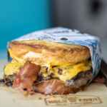 180gr. Pan volteado, mantequilla, 3 rebanadas de queso americano, cebolla asada, tocino y aderezo Alioli Holy Cow!