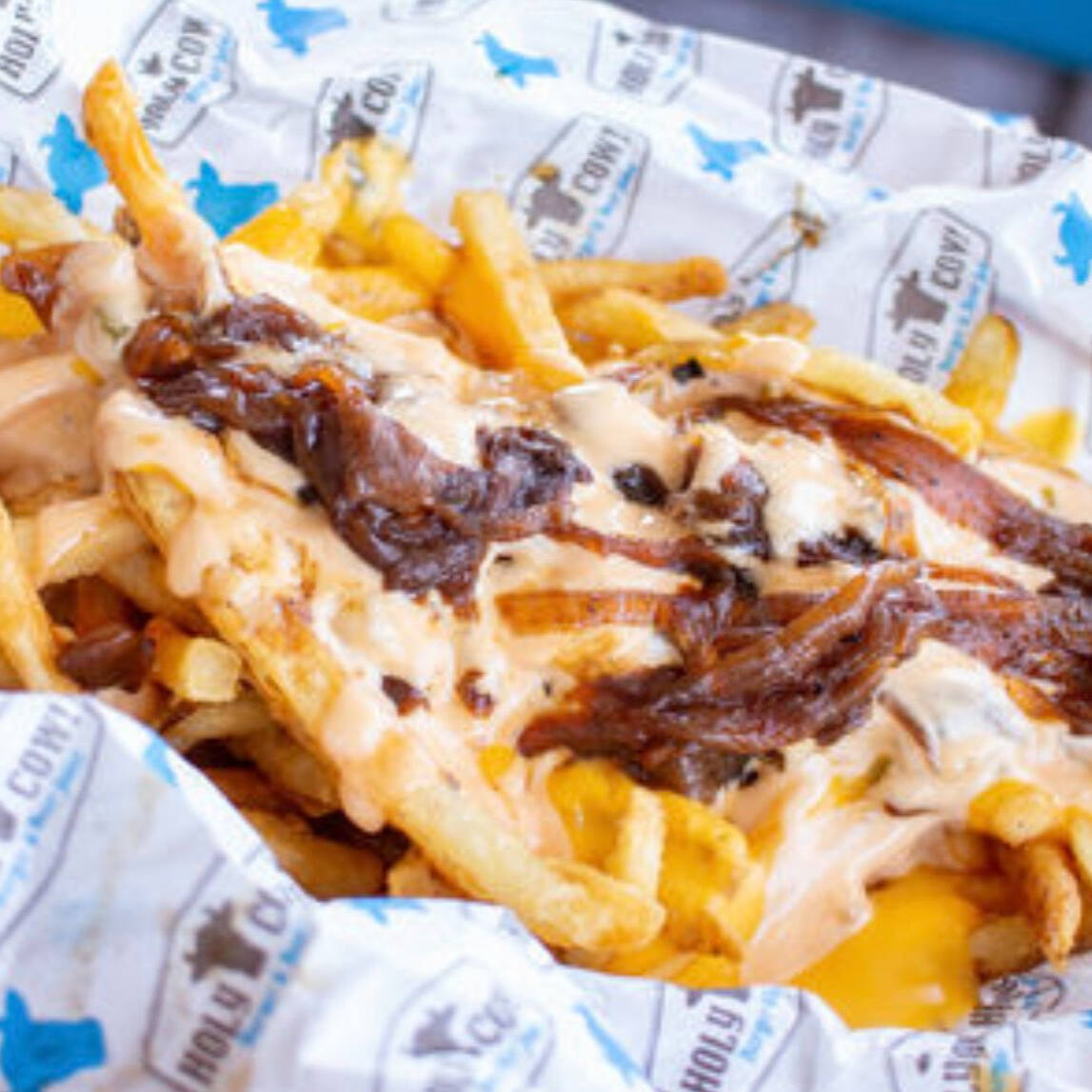 350gr. Cama de papas fritas bañadas de salsa de queso cheddar, aderezo y cebolla caramelizada.