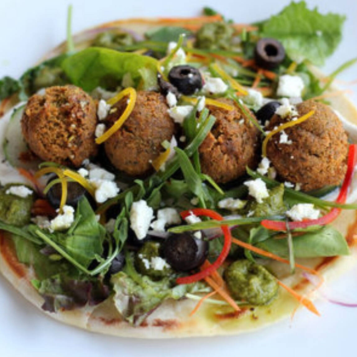 80gr. Croquetas de garbanzo en pan pita, Taztziki, pepino curtido en shiso, tomate, pimientos, cebolla morada, zanahoria, spring mix, queso Feta, pesto de cilantro y vinagreta de limón real.