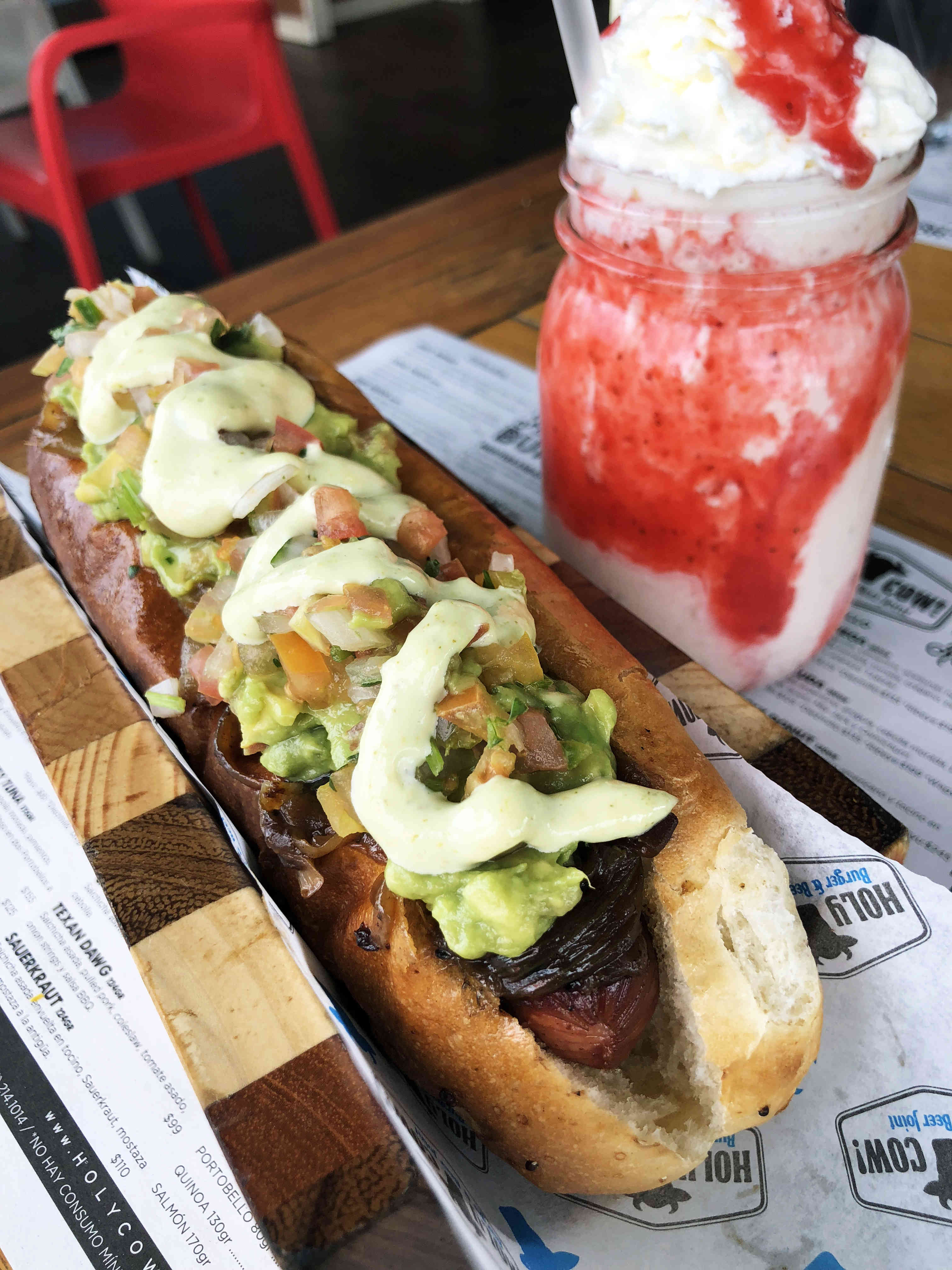 124gr. Salchicha asada envuelta en tocino, cebolla caramelizada, guacamole, salsa bandera y aderezo Mayo-Cilantro.