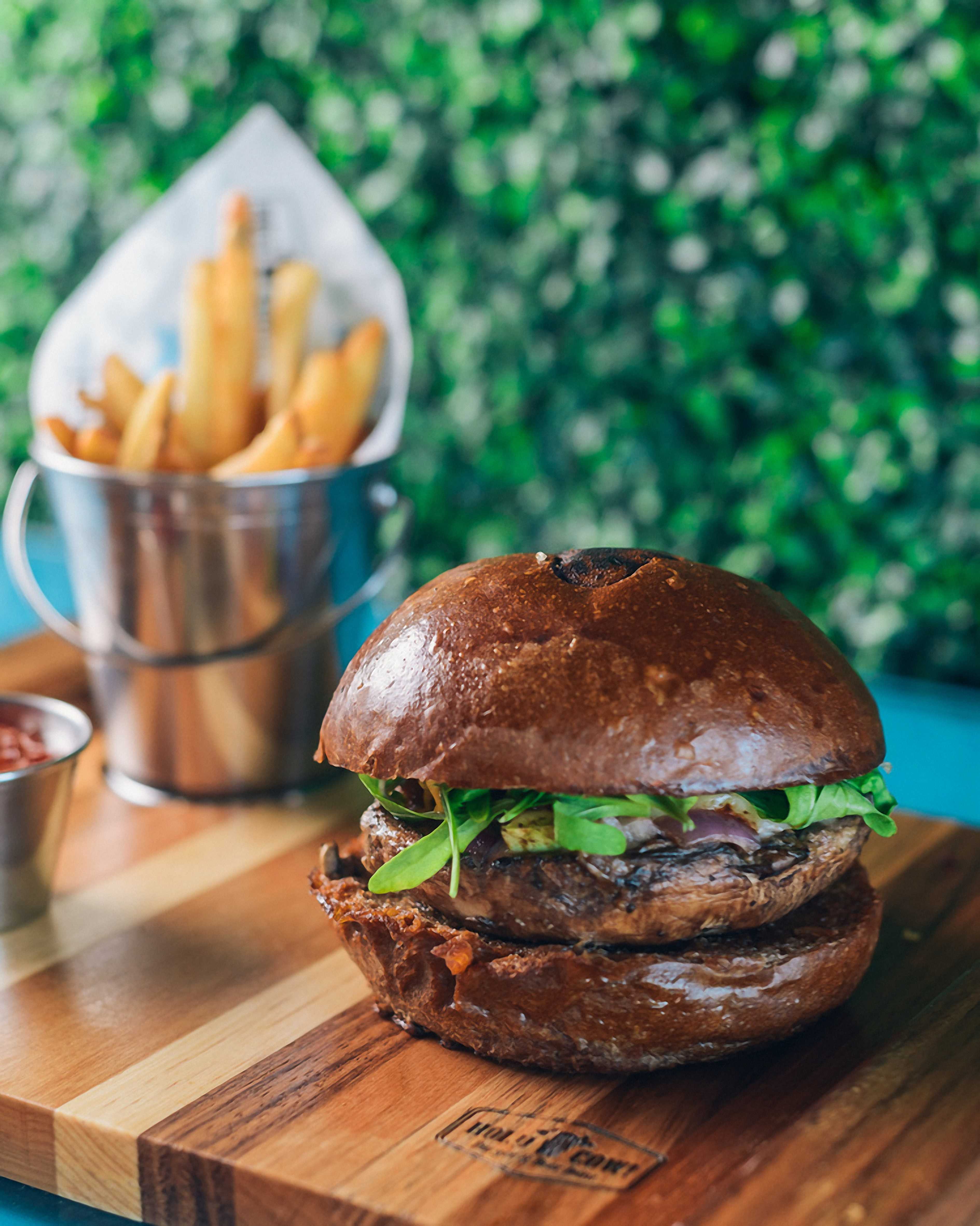 Portobello marinado asado relleno de verduras (cebolla, pimientos y calabaza), salsa de tomate, queso mozzarella, arúgula y aderezo alioli holy cow, 150 gr.