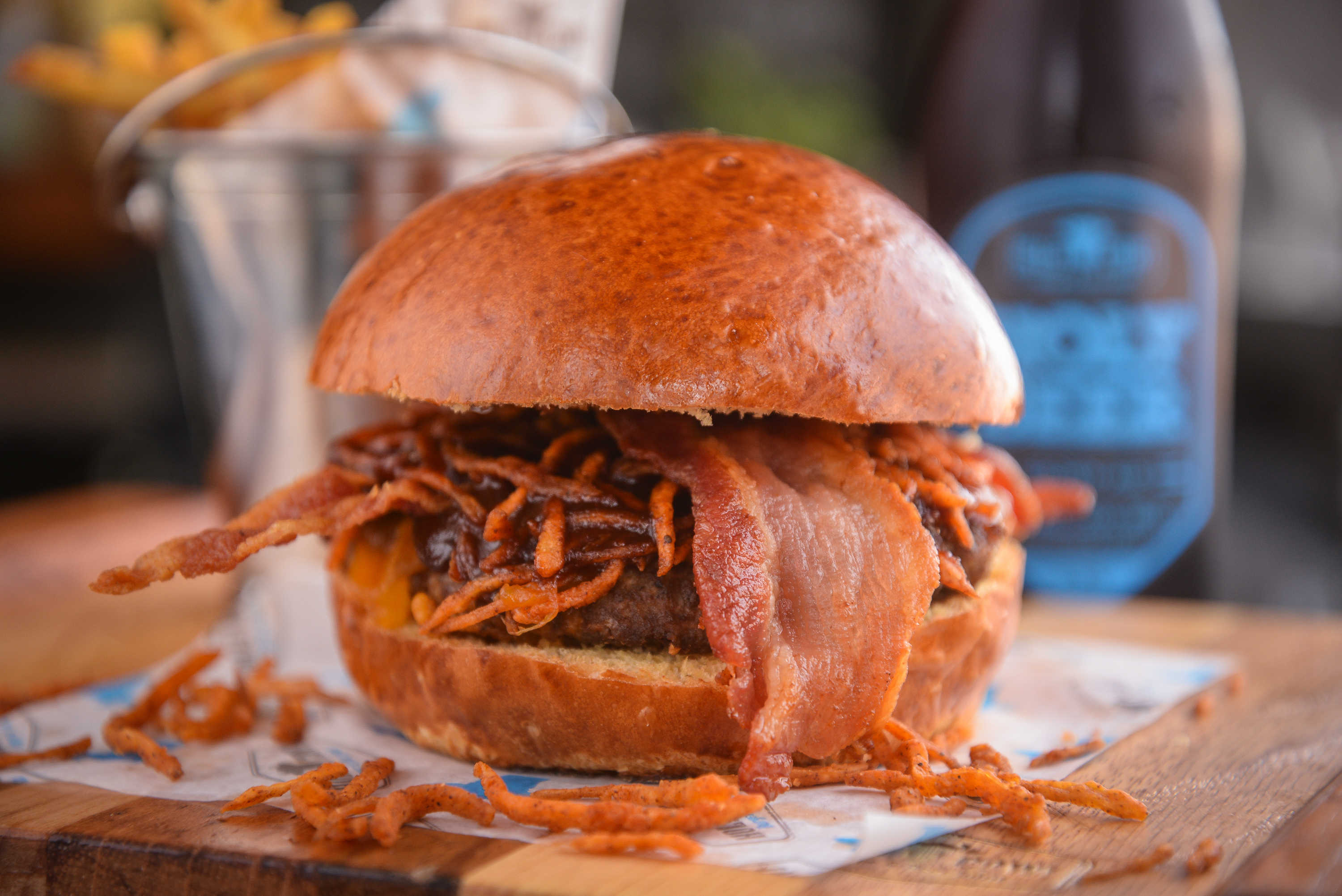 Pollo/Holyblend, onion strings, tocino, queso cheddar y salsa BBQ, 180 gr.