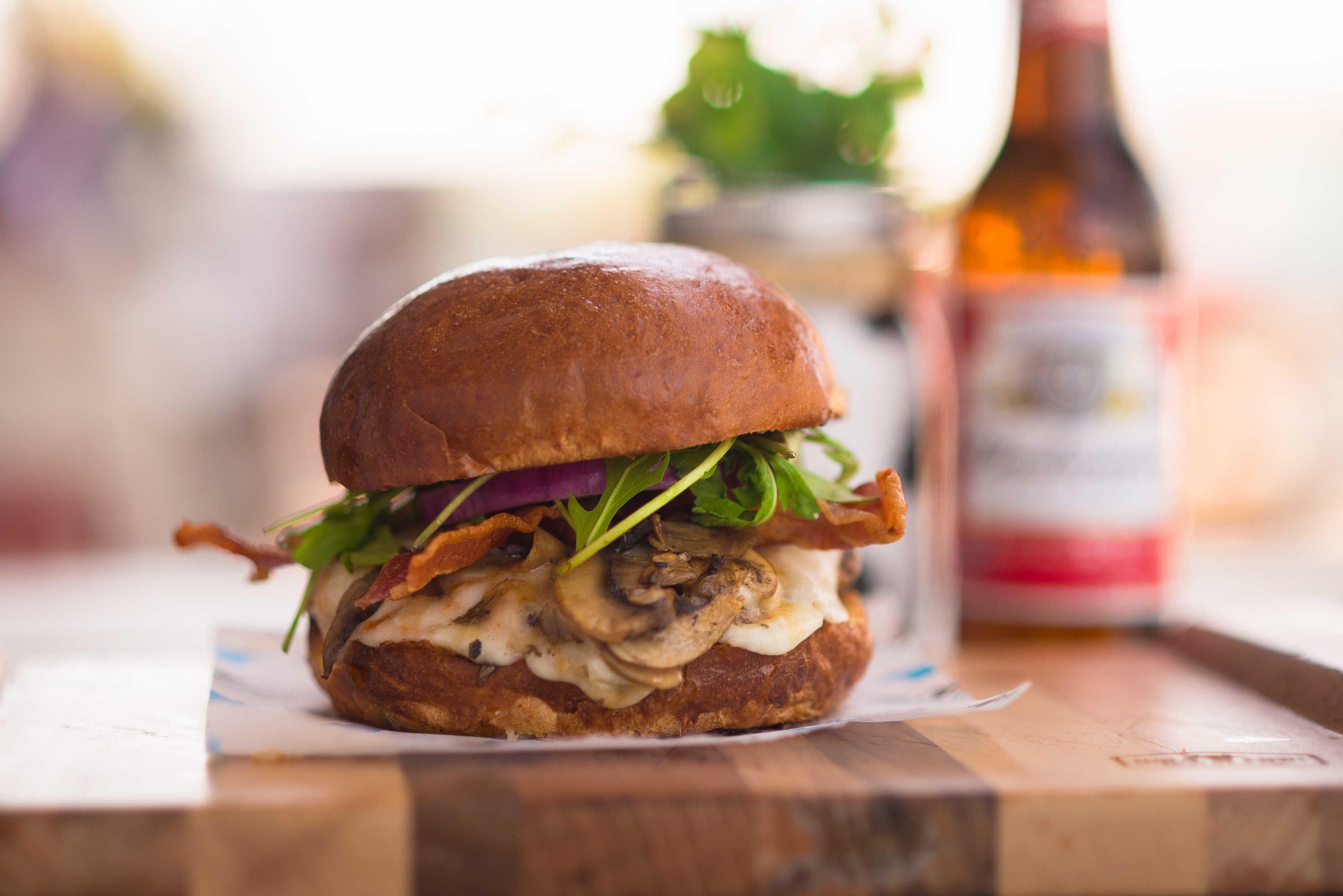 Pollo/Holyblend, rellena de queso azul (15 gr.), arúgula, tocino, champiñones salteados, cebolla caramelizada y aderezo alioli holy cow, 180 gr.