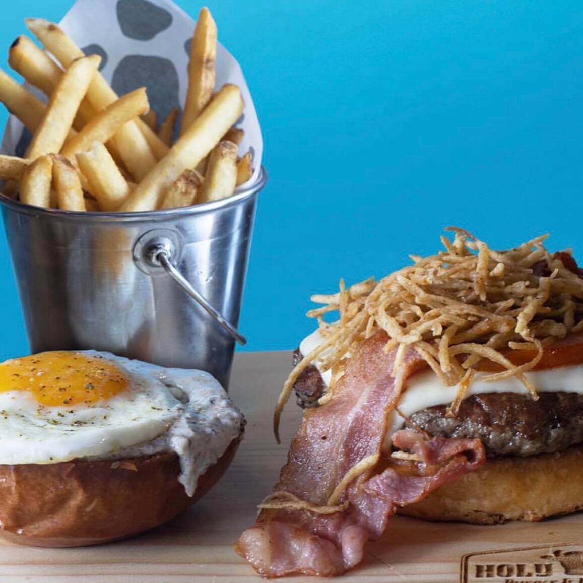 180gr. Sazonador de trufa, tomate asado, queso mozzarella, onion strings, tocino, huevo frito y aderezo de trufa.