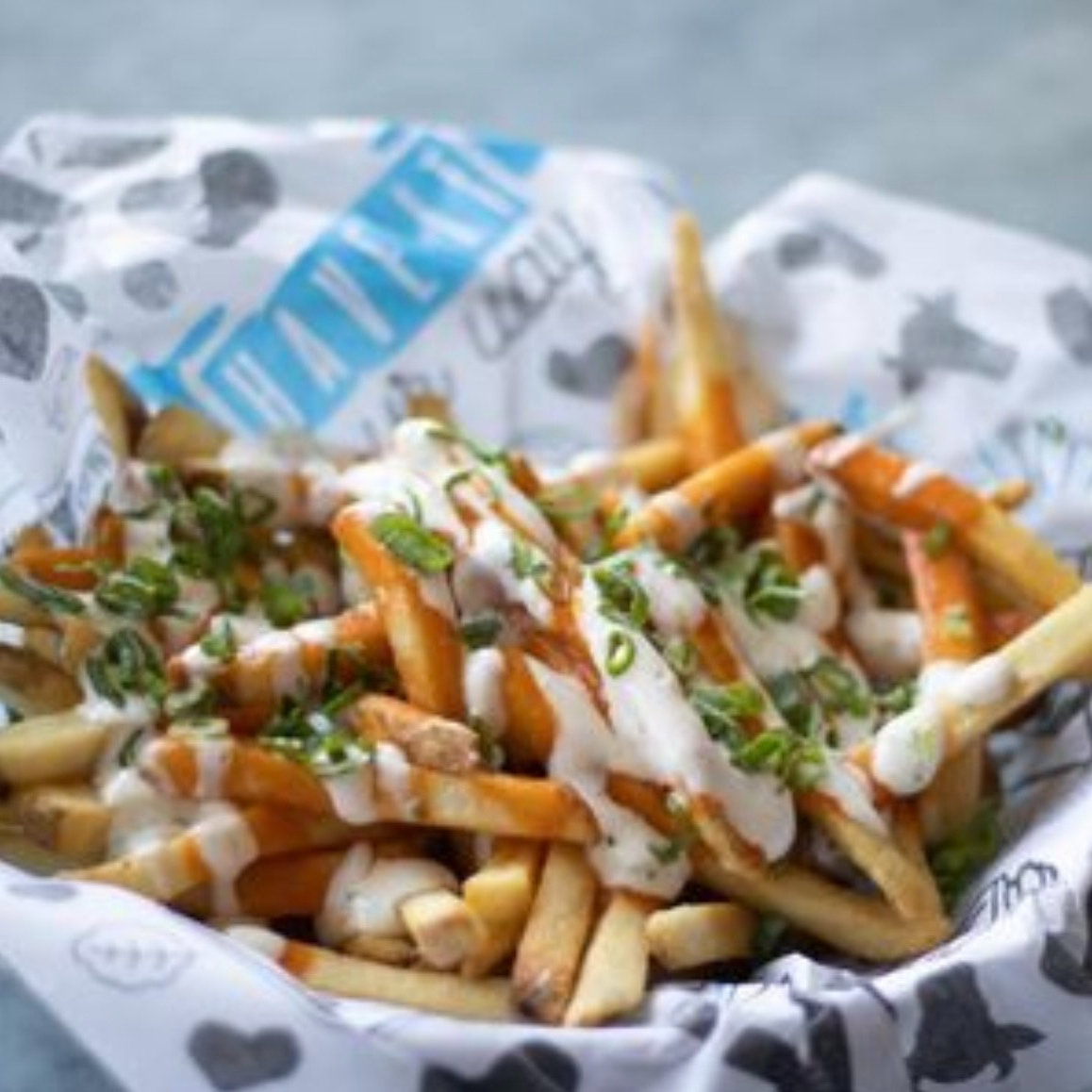 350gr. Cama de papas fritas bañadas de salsa buffalo, aderezo ranch y decorado con cebollín.