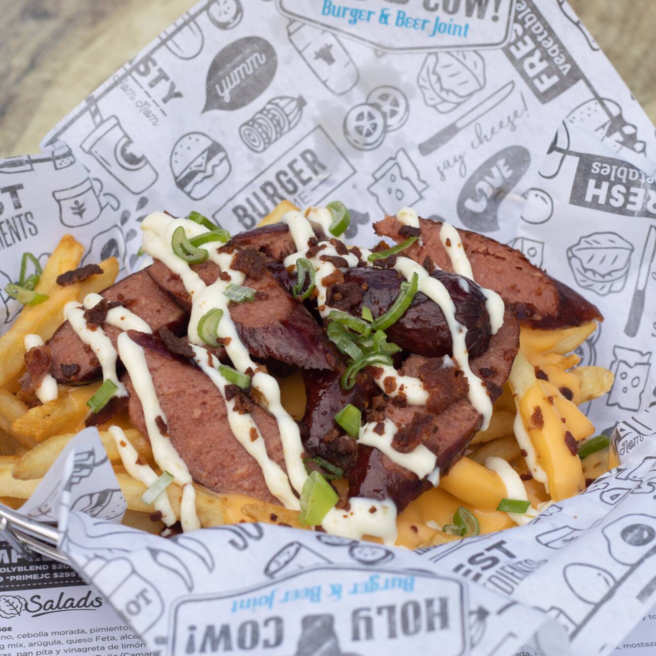 350gr. Cama de papas fritas bañadas en Cheddar cheese sauce, cebolla caramelizada y aderezo Holy Cow!